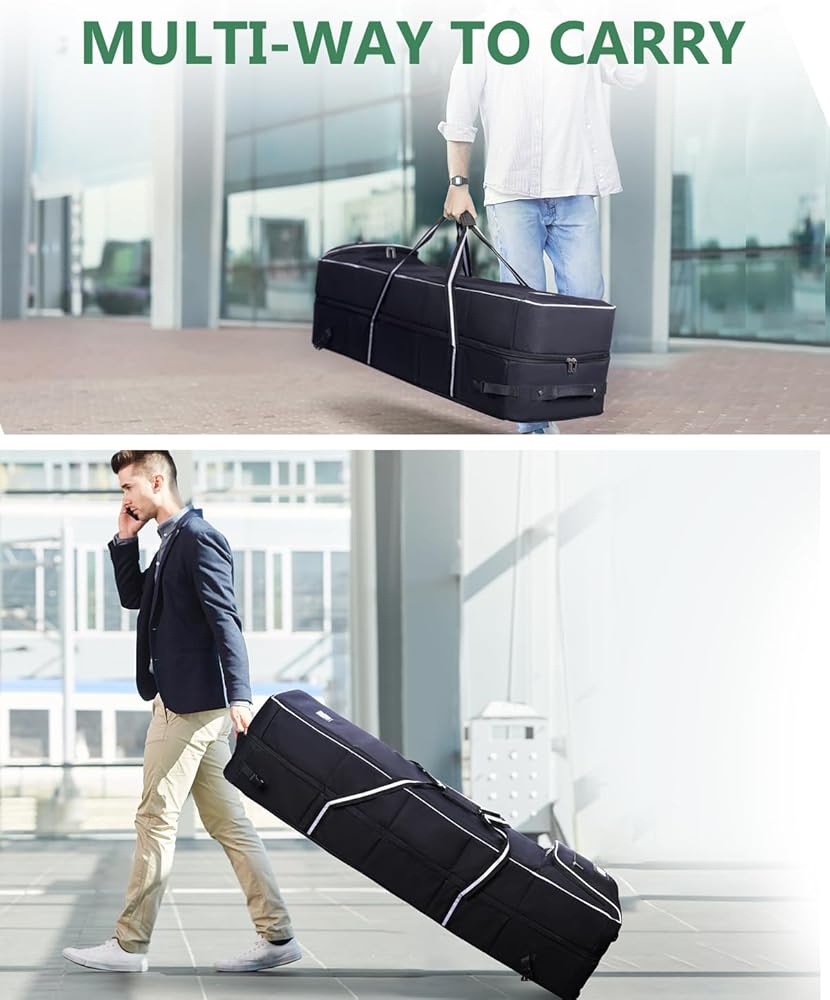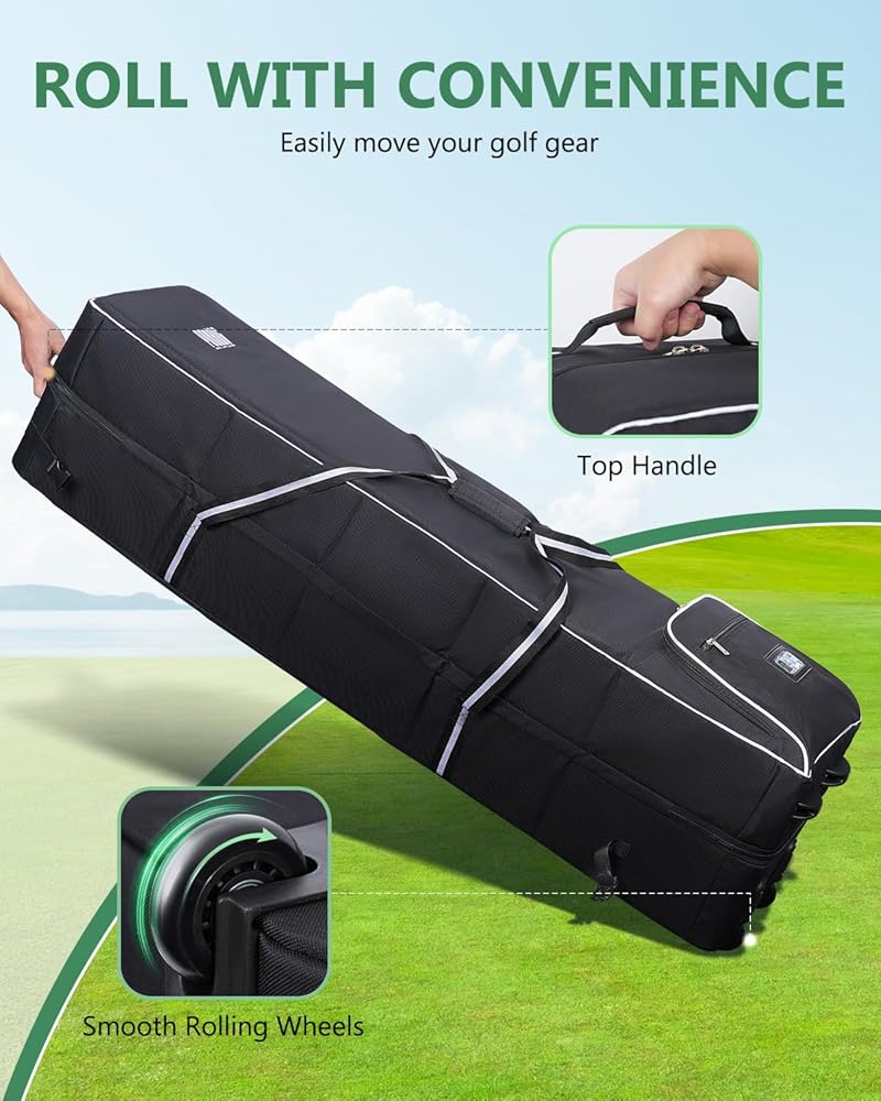 عجلات مطاطية: تتميز حقيبة سفر الجولف بعجلات ناعمة ولوحة ركلة مصبوبة. تسمح لك العجلات الناعمة بالتحرك دون جهد وبكل راحة. تحمي لوحة الركل الجزء السفلي للاستخدام الممتد