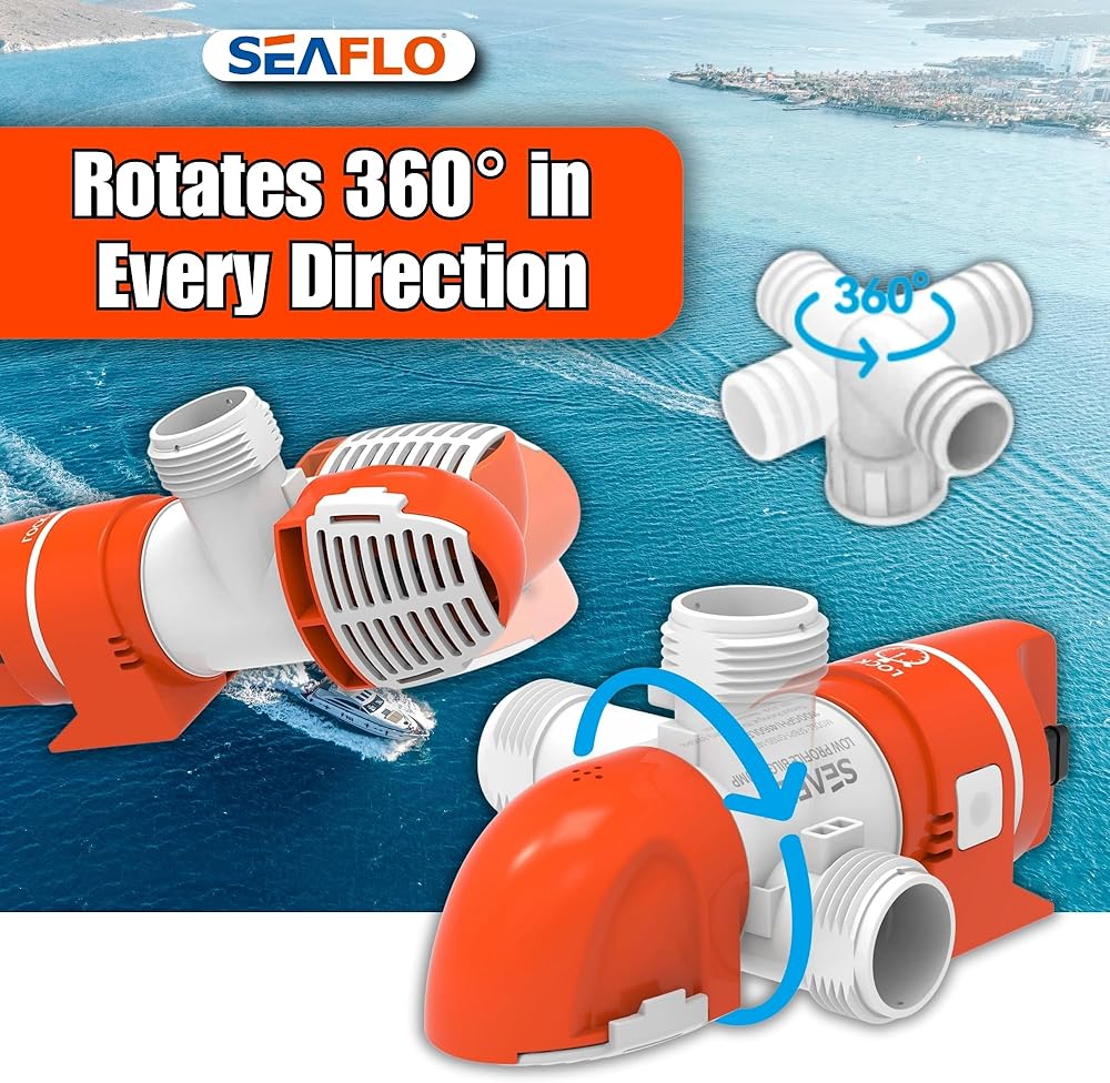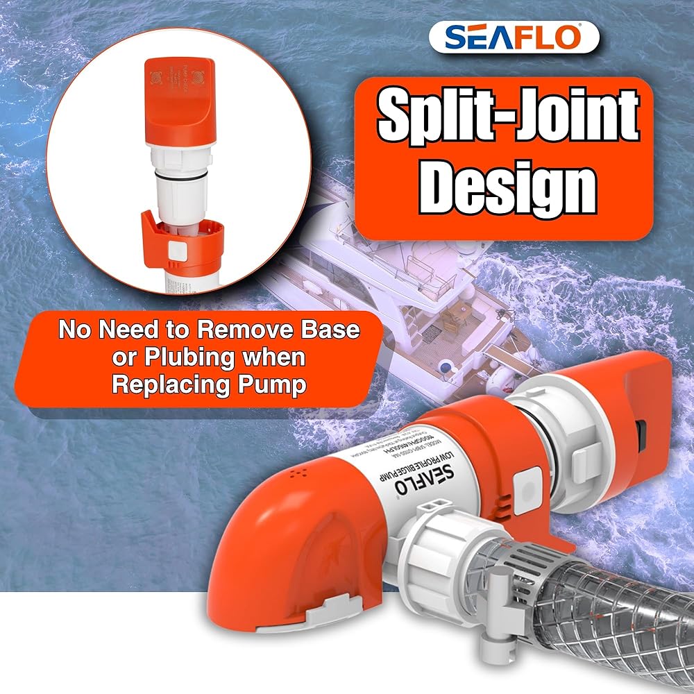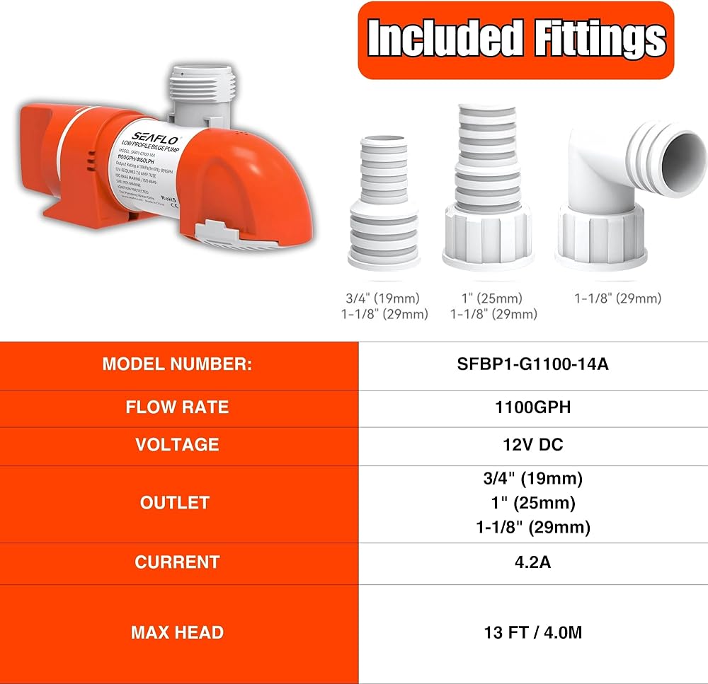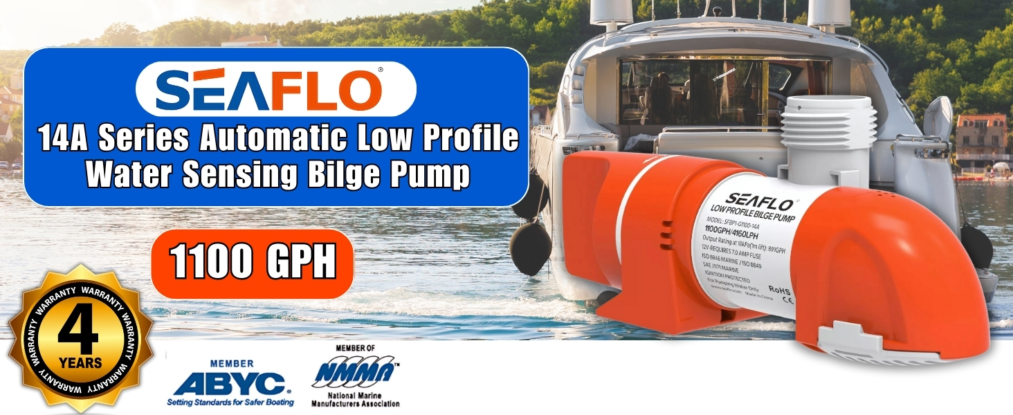 مضخة نزح لاستشعار المياه من السلسلة SEAFLO 14A 12V 1100 GPH أوتوماتيكية منخفضة المستوى | تصميم مدمج، وصمامات فحص، وتفريغ بزاوية 360 درجة، وضمان لمدة 4 سنوات