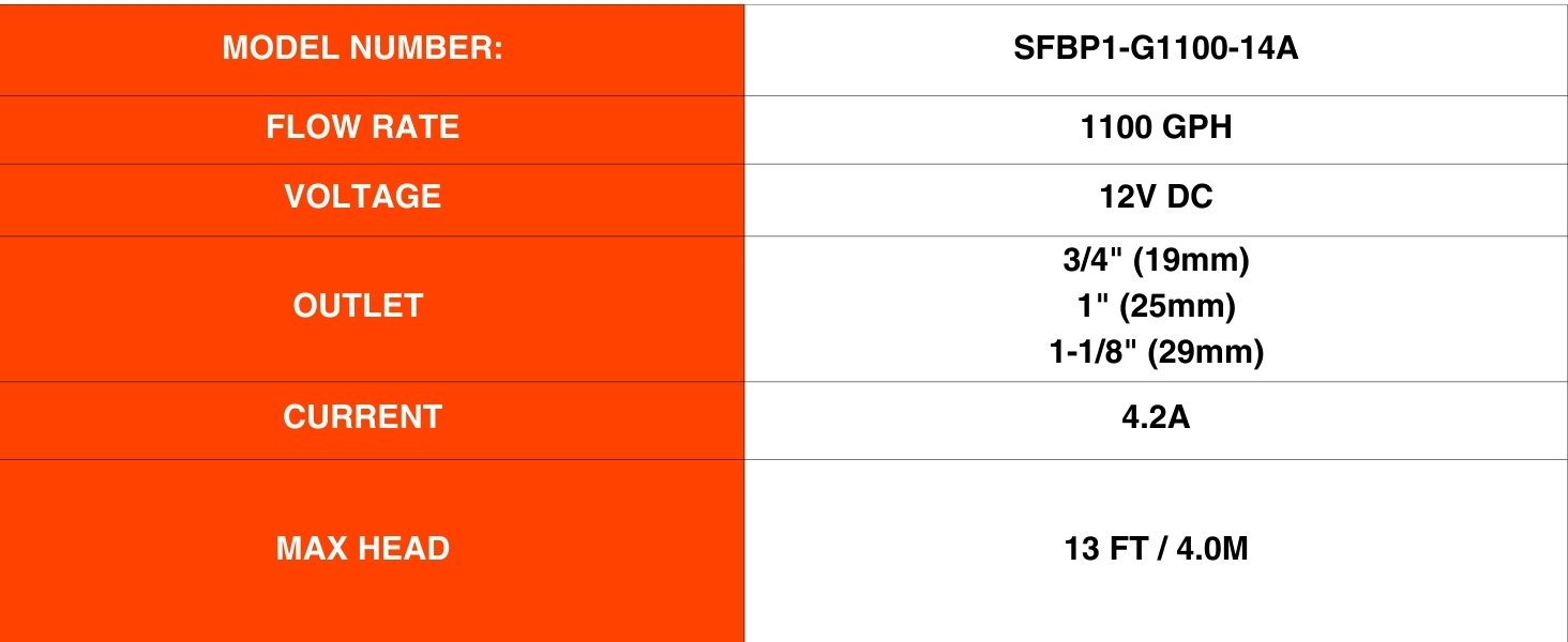 [المواصفات]: رقم الموديل: SFBP1-G1100-14A معدل التدفق: 1100 جالون في الساعة الجهد الكهربائي: 12 فولت تيار مستمر الحد الأقصى للسحب: 4.2 أمبير الحد الأقصى للرأس: 13 قدمًا (4.0 متر) التشغيل: تلقائي مع مستشعر الماء قطر المخرج: 3/4 بوصة (19 مم)، 1 بوصة (25 مم)، 1-1/8 بوصة (29 مم)