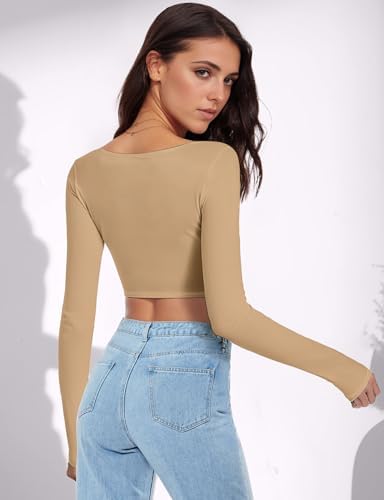 • 【UNIQUE DESIGN】 The womens long sleeve crop top is a must-have addition to every fashion-forward woman's wardrobe. Designed with a sexy square round neck, this crop top is sure to turn heads wherever you go. The slim-fit design enhances your curves and gives you a confident and stylish appearance. The length of the top is just right, sitting just above the navel to create a flattering and trendy look.