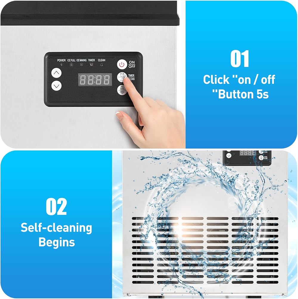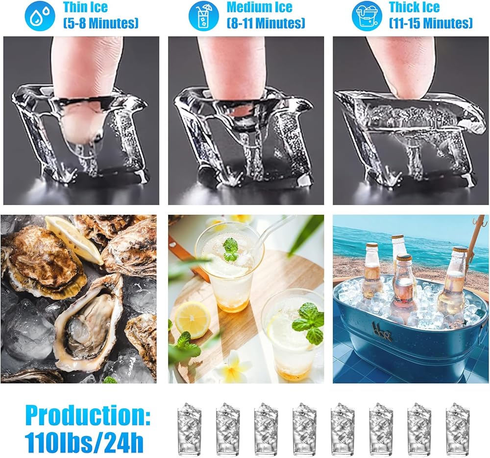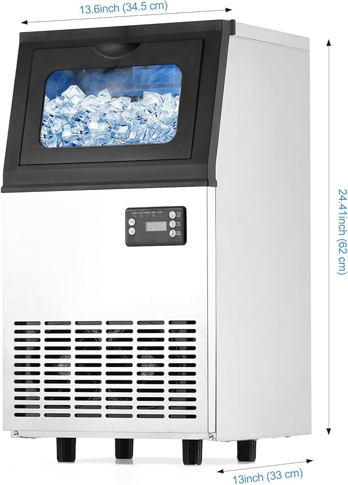 🥤إنتاج عالي للثلج: قادر على إنتاج ما يصل إلى 110 رطل من الثلج يوميًا، أي ما يقرب من 6,050 مكعب ثلج، وتستغرق كل دورة من 8 إلى 15 دقيقة فقط. يشتمل على صندوق تخزين ثلج بوزن 18 رطلاً لضمان حصولك دائمًا على كمية جاهزة من الثلج