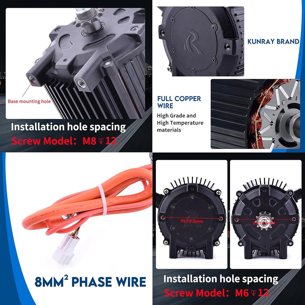 • 【معلمات مجموعة المحرك 72 فولت】محرك تيار مستمر كهربائي بدون فرش، المجلد المقدر 72 فولت، الوات المقدر 5000 وات، الذروة 10 كيلو وات، السرعة المقدرة 6800 دورة في الدقيقة (لا توجد سرعة تحميل: 8000 دورة في الدقيقة)، عزم الدوران المقدر 8.5 نيوتن متر، الذروة 35 نيوتن متر، التيار المقدر 60 أمبير (الذروة 80-) 100 أ). محرك Go Kart الكهربائي، قلب نحاسي نقي، أقصى قدر من الكفاءة 90%، موفر للطاقة، مع مقاومة درجات الحرارة العالية، محرك BLDC متوافق مع ضرس T8F/35H، تم تصنيعه بواسطة Kun-ray KR5V.