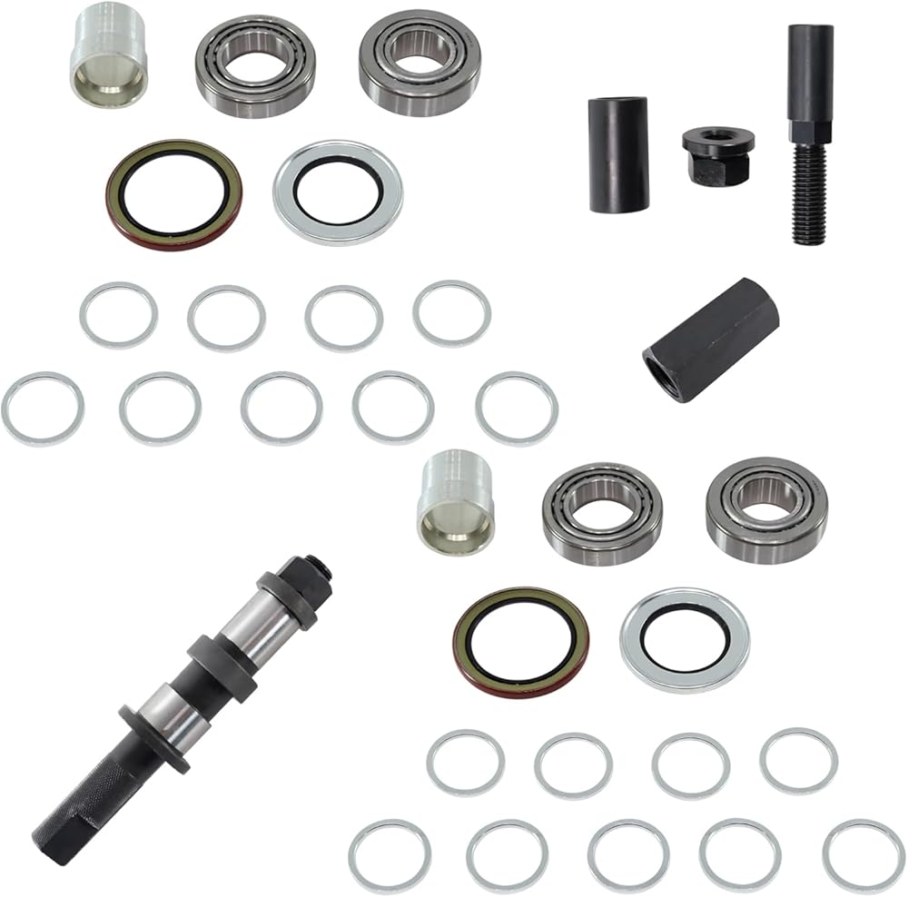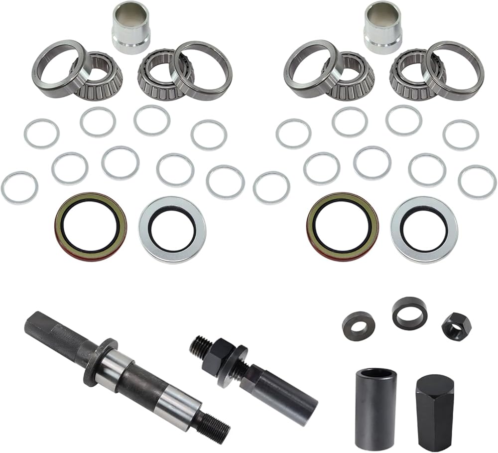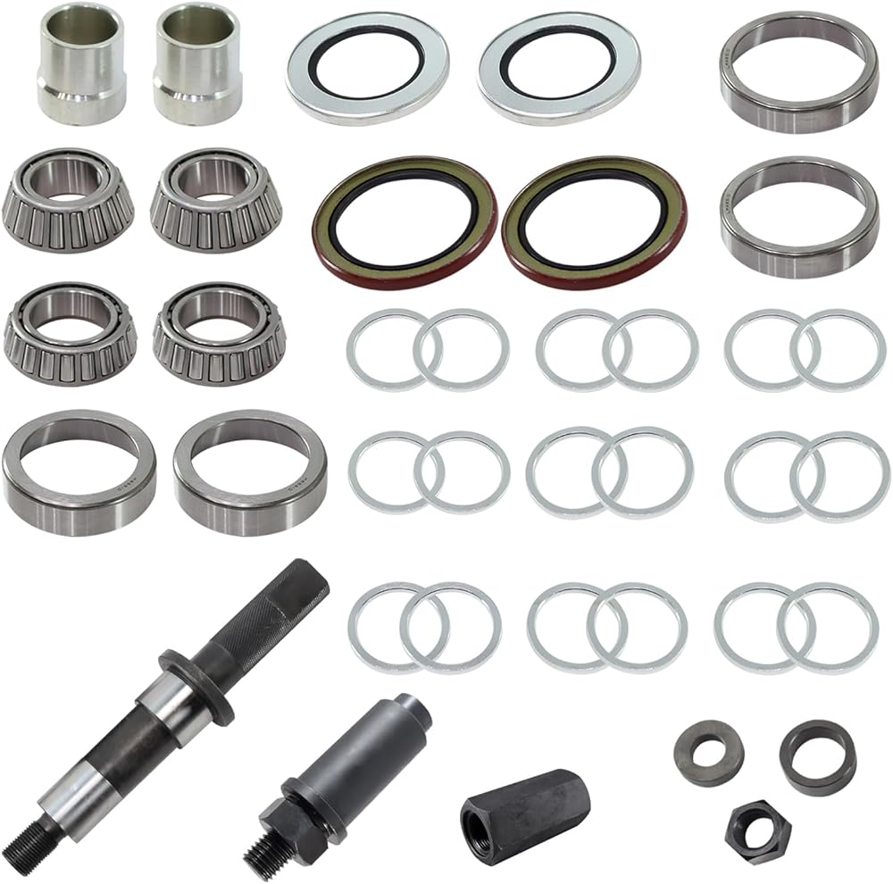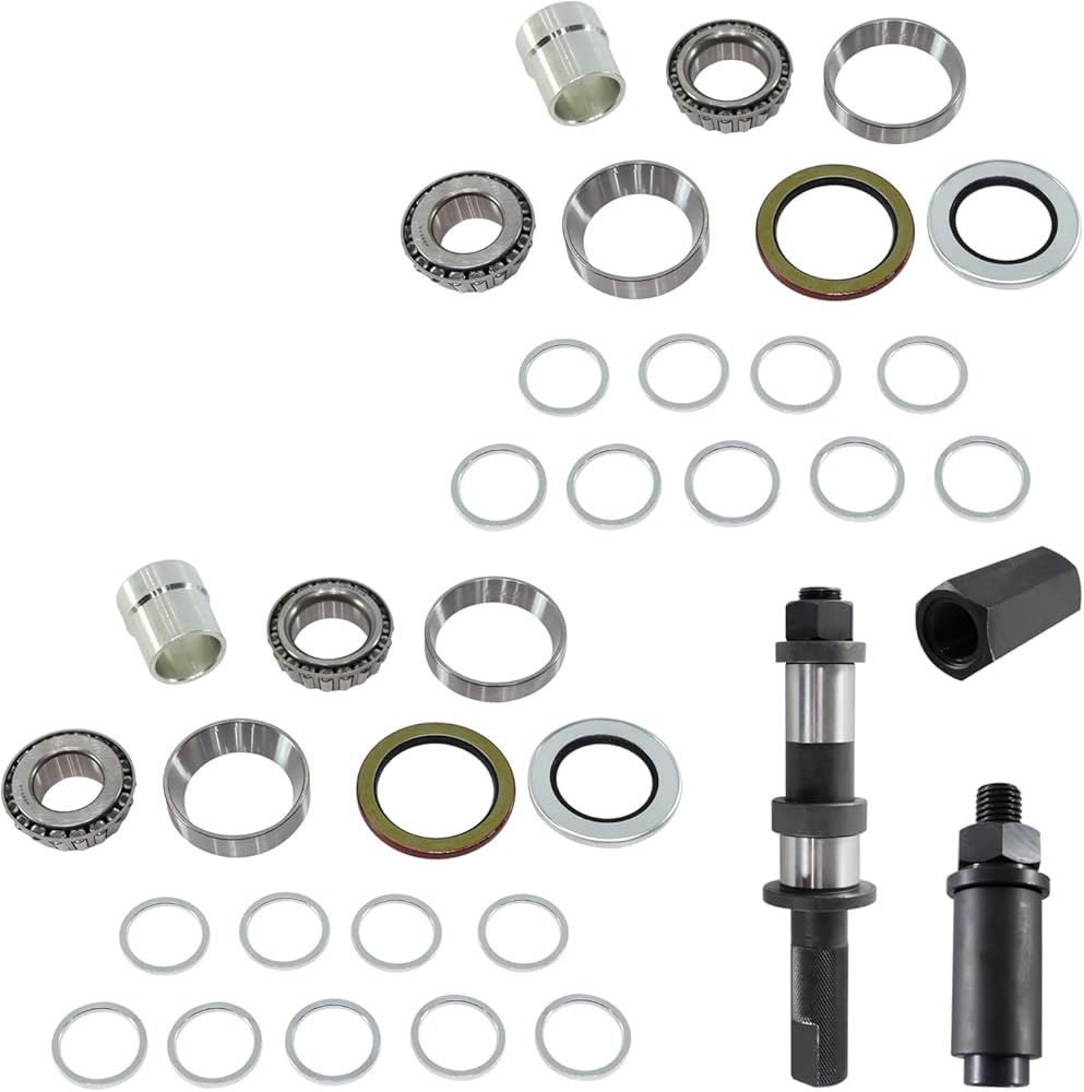 - 【PACKAGE INCLUDES】: 1 x Spindle Wheel Bearing Set Up Install Tool ; 1 x Spindle Knockout Removal Remover Tool ; 1 x Spindle Installation Tool ; 2 x Inner Wheel Bearings ; 2 x Inner Races ; 2 x Outer Wheel Bearings ; 2 x Outer Races ; 2 x Inner Seals ; 2 x Outer Seals ; 2 x Bearing Spacers ; 18 x Bearing Shims