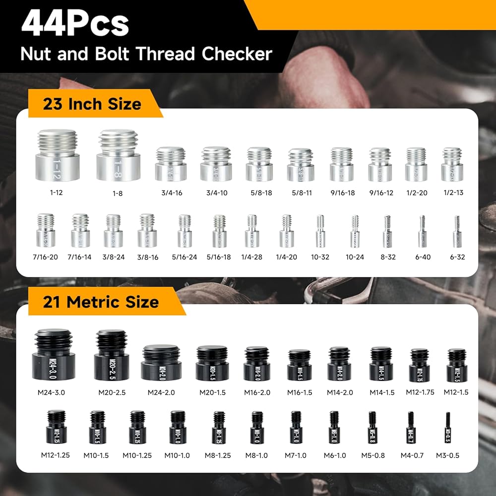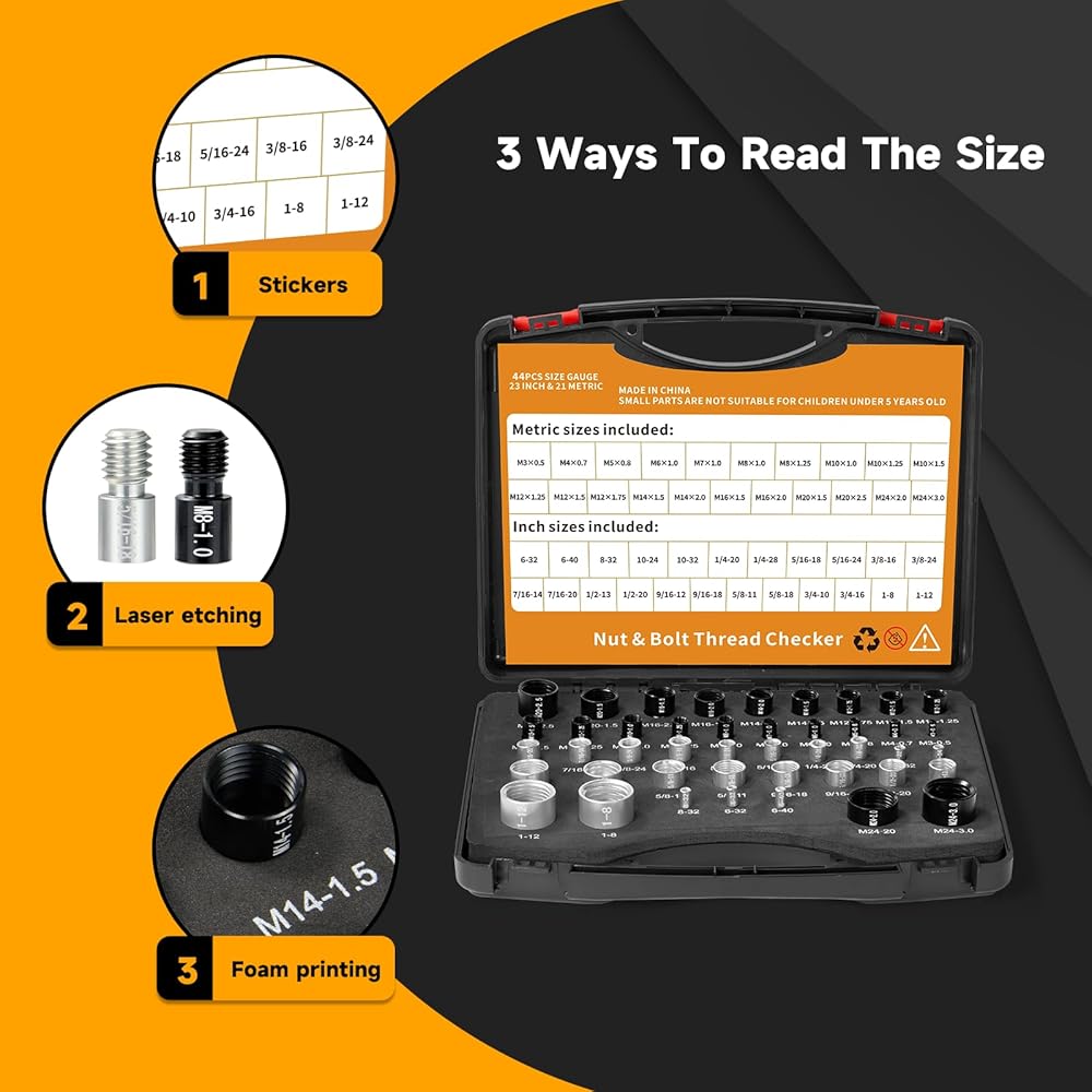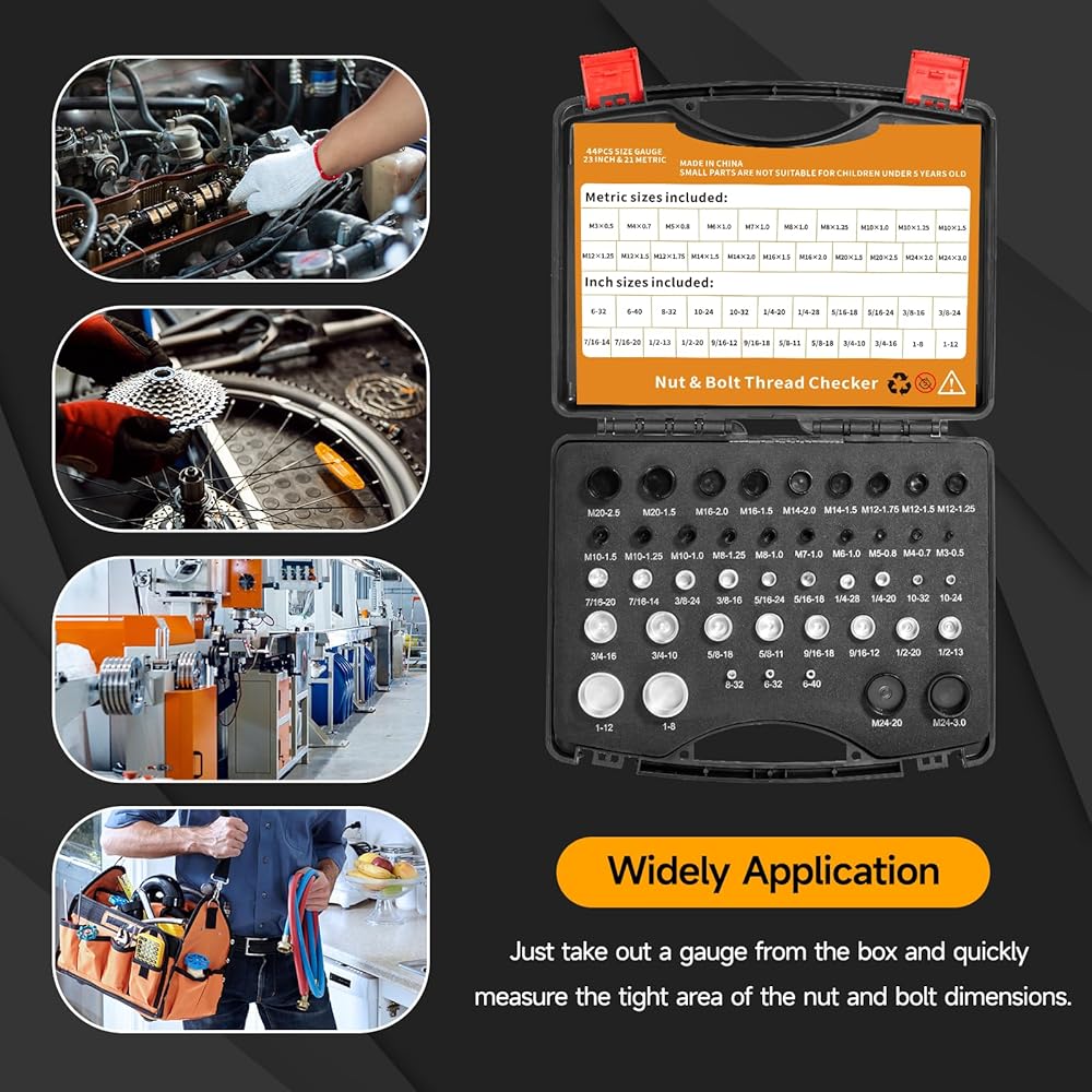 تطبيق واسع: يعد حجم المسمار ومجموعة قياس الخيوط أمرًا ضروريًا للحرفيين والميكانيكيين والمقاولين، ويمكن أيضًا تقديمه للعائلة أو الأصدقاء الذين يحبون الإصلاح أو DIY؛ يمكن لأحجام البراغي ومجموعة قياس الخيوط العثور على الحجم الدقيق لأي صامولة أو مسمار في ثوانٍ، مما يبسط عملهم ويساعدهم على توفير الوقت؛