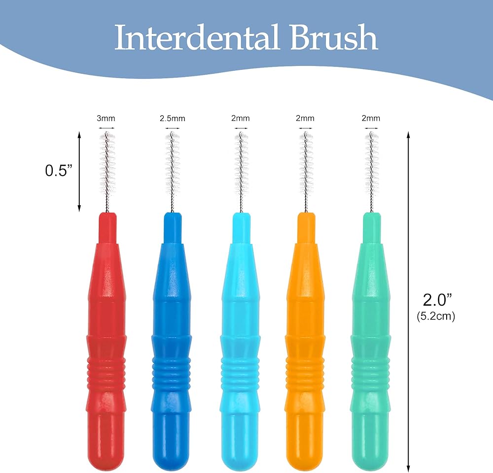 الحجم واللون: 5 ألوان مختلفة (10 قطع من كل لون)، 3 أحجام لرؤوس فرشاة الأسنان: قطر رأس الفرشاة الحمراء 3 مم؛ قطر رأس الفرشاة الزرقاء 2.5 مم؛ يبلغ قطر رأس الفرشاة باللون البرتقالي والأخضر والأزرق الفاتح 2 مم.