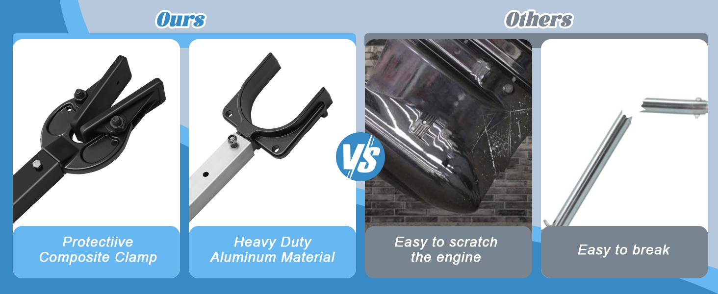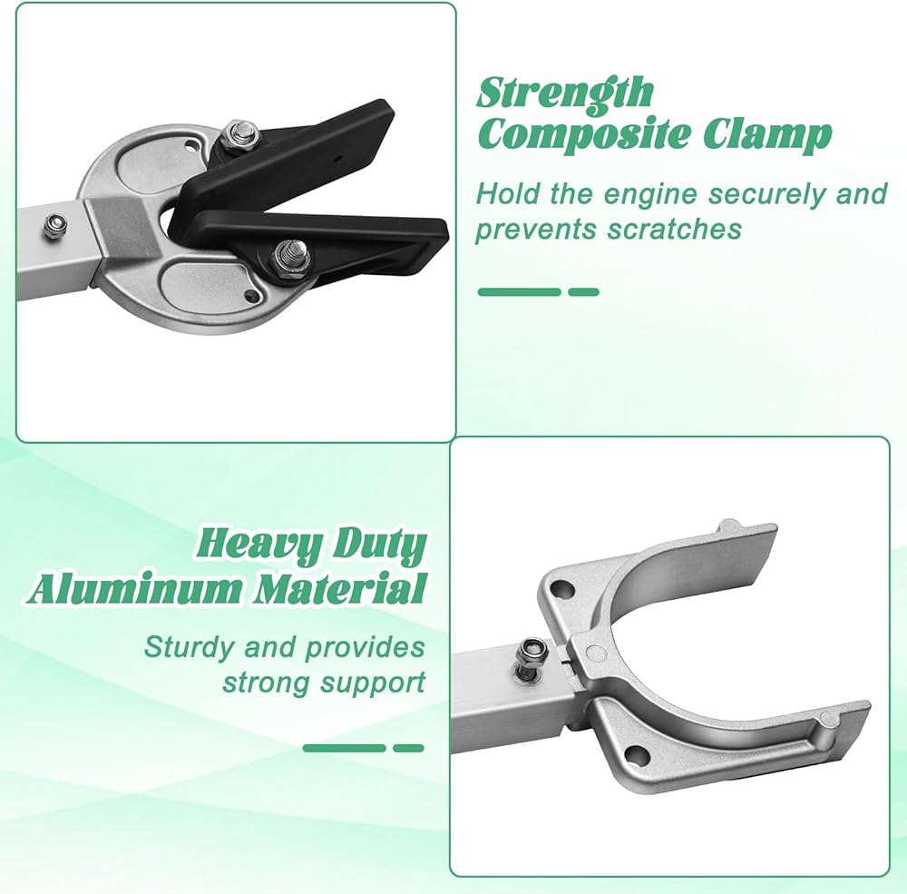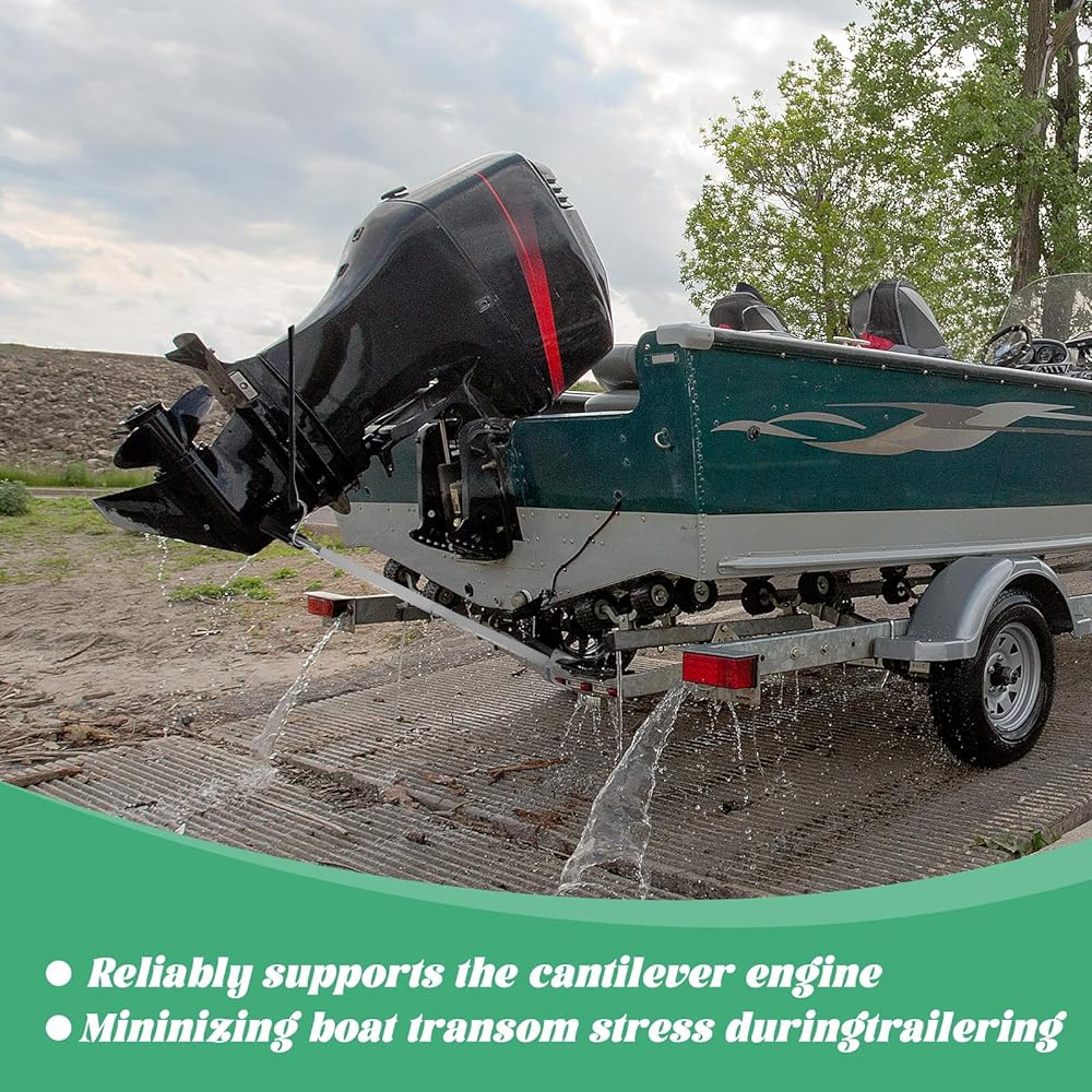 【دعم قوي】يتكون موفر النقل من مادة الألومنيوم الصلبة وشديدة التحمل، ويمكنه دعم المحرك الكابولي بشكل موثوق أثناء السحب، وتخفيف الضغط على المؤخرة، وتجنب الاصطدام بين المؤخرة والمحرك، وتقليل الضغط والأضرار المحتملة الناجمة عن وزن المحرك الخارجي.