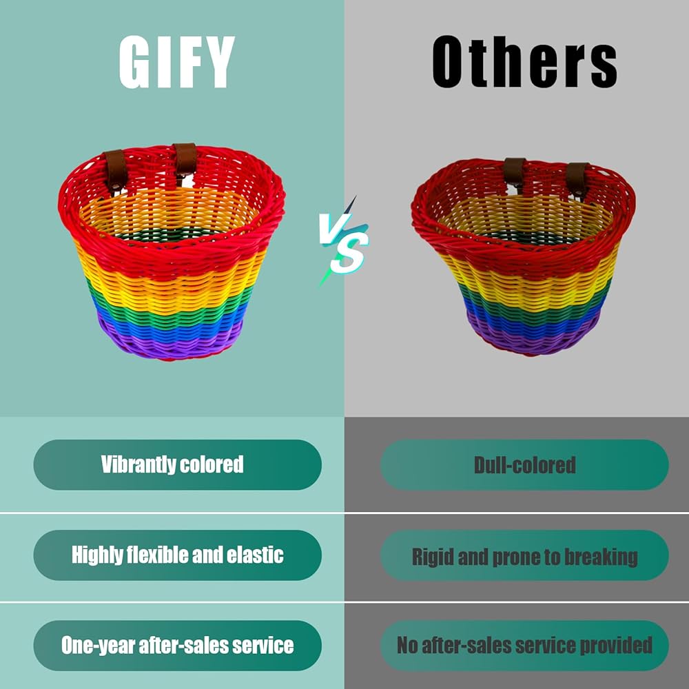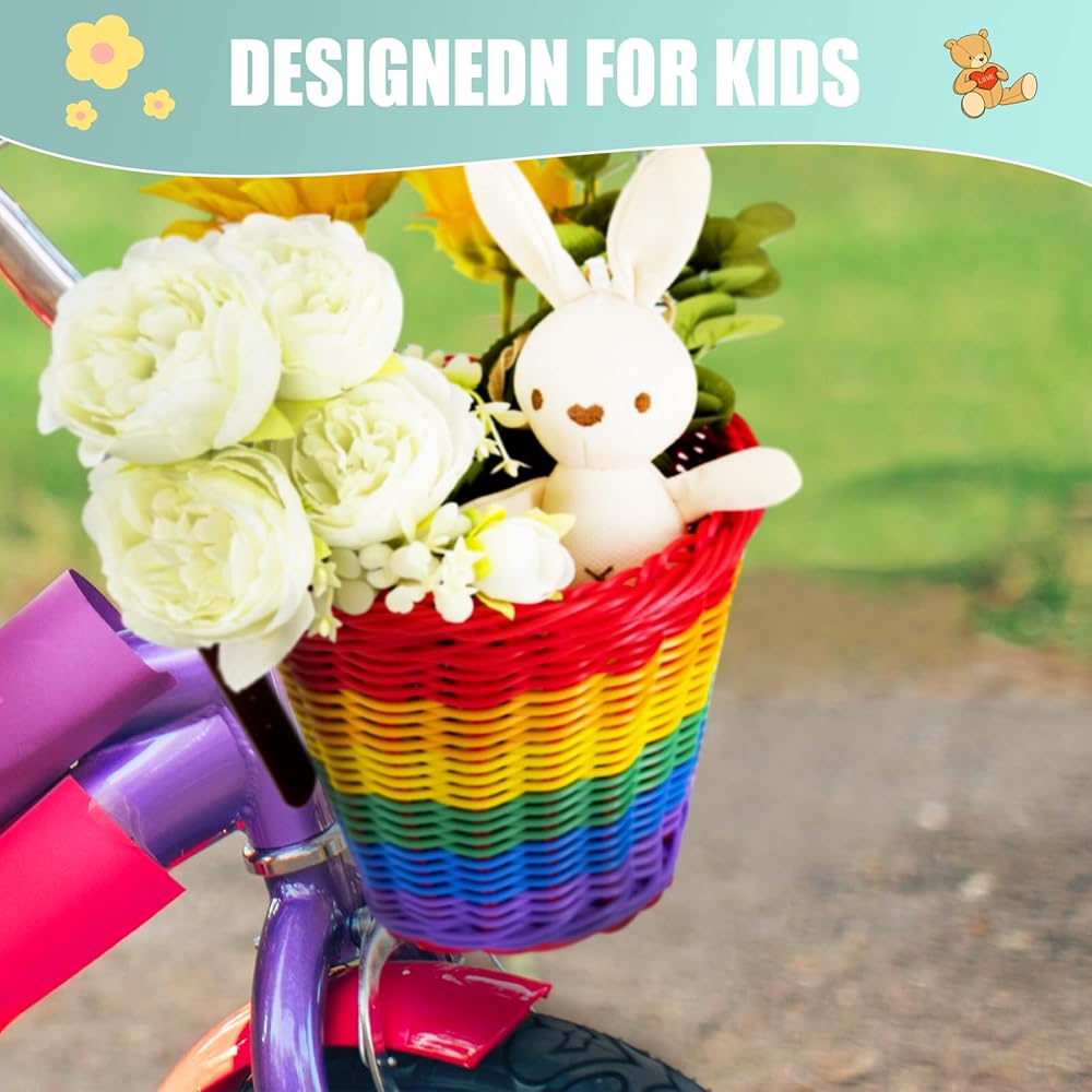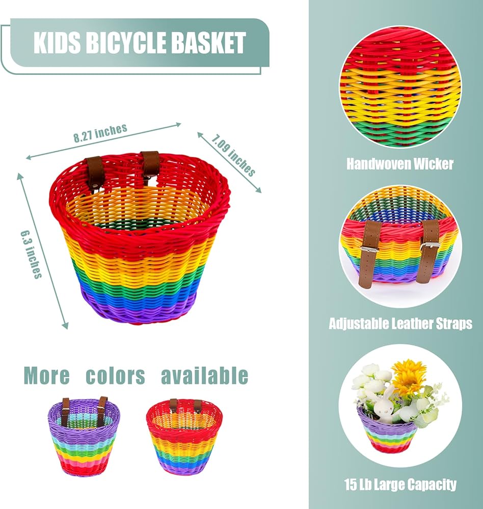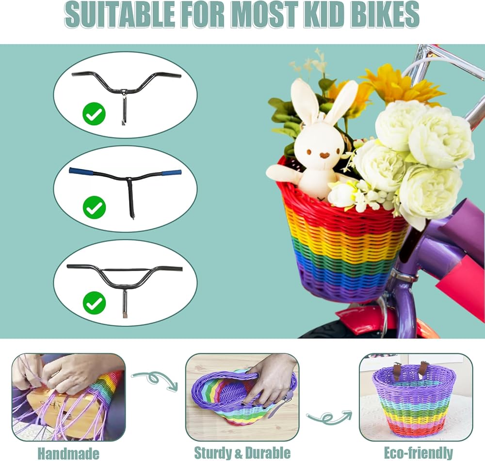 تصميم نابض بالحياة وساحر: أضف لمسة من الألوان إلى دراجة طفلك مع سلة الدراجة المنسوجة يدويًا بألوان قوس قزح. يعزز تصميمها المبهج الجمال العام للدراجة، مما يضمن قيادة طفلك الصغير بأناقة مع جذب انتباه الجميع!