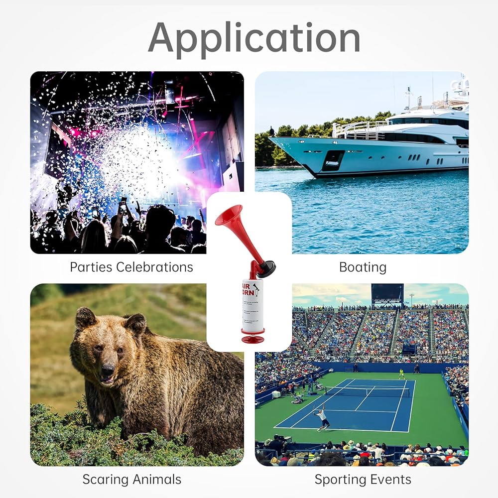 - Application: The handheld air horns are widely used in emergency situations(boating, biking, jogging, walking), scaring off (bears, other wild animals), outdoor activities (camping, climbing, hiking), celebrations (parties, graduations, birthdays, football games, races) and other events.