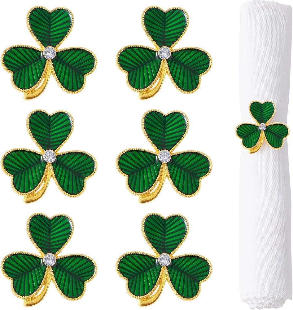 مجموعة حلقات منديل شامروك الخضراء لعيد القديس باتريك مكونة من 6 - حامل مناديل شامروك معدني ذهبي، حلقات منديل ربيعية لديكور طاولة الزفاف في عيد القديس باتريك