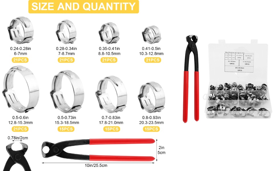 مجموعة متعددة الاستخدامات: تتضمن مجموعة متنوعة من المشبك المكونة من 150 قطعة 8 أحجام مختلفة من حلقات التجعيد (6-23.5 مم) وكماشة تجعيد بمشبك الأذن مقاس 9 بوصات. جميع أحجام المشبك الأنبوبي معبأة في حقيبة متينة ومريحة، توجد مساحات صغيرة مختلفة في صندوق التخزين لتصنيف الأحجام المختلفة، مما يخفف من مشكلة العثور على حجم معين. قم بترقية صندوق الأدوات الخاص بك باستخدام هذه المجموعة الأساسية وتعامل مع أي مشروع بثقة.