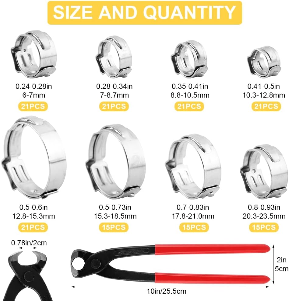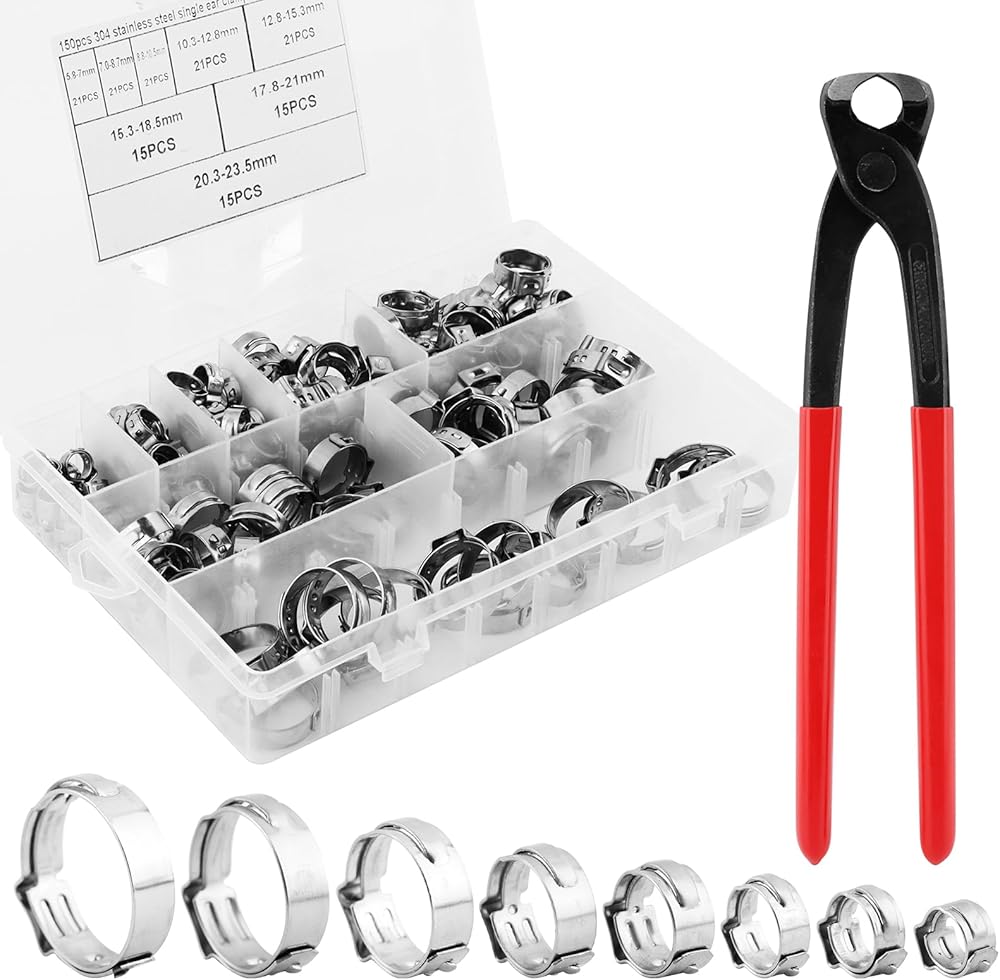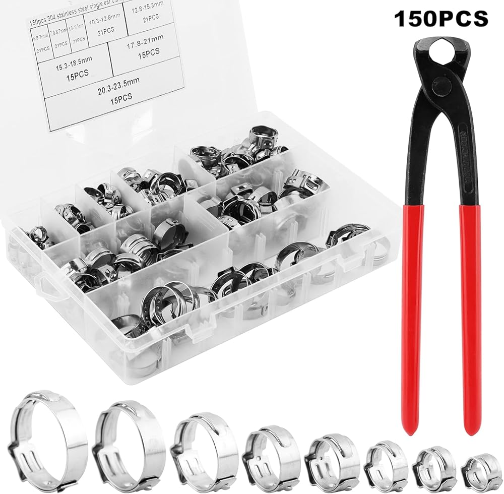 مجموعة متنوعة من 150 قطعة من مشبك التثبيت مع كماشة مكشكشة بمشبك الأذن مقاس 9 بوصة، 8 مقاسات 6-23.5 مم حلقات ربط خرطوم المشابك، مجموعة أدوات تجعيد قرصة مناسبة لتوصيل الأنابيب