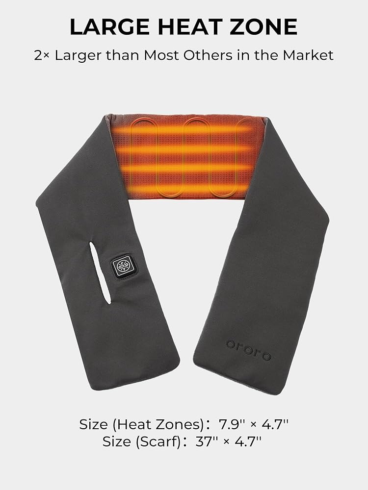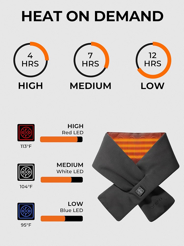 Scarf: Up to 12 working hours (4 hrs on high, 7 hrs on medium, 12 hrs on low heating setting)