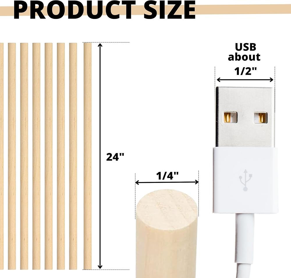 The 12-inch size of these dowels for crafting, small wooden dowels for crafts is very handy and practical. Experiment with length. If the wood dowel you are using is too long, just cut it to size. And the 1/4 inch thickness will add aesthetics to your work without being flimsy at all