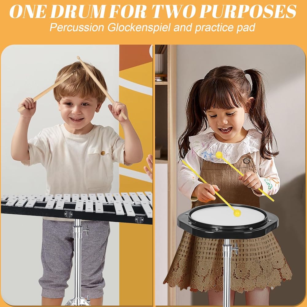 【طبل ممارسة صامت مقاس 8 بوصات】يمكن استخدام طقم جرس إكسيليفون غلوكنسبيل مع طبلة صامتة مقاس 8 بوصات، والتي يمكن تكوينها باستخدام طبلة صامتة. يمكنك التدرب على آلتين مختلفتين في وقت واحد والتعرف عليهما.