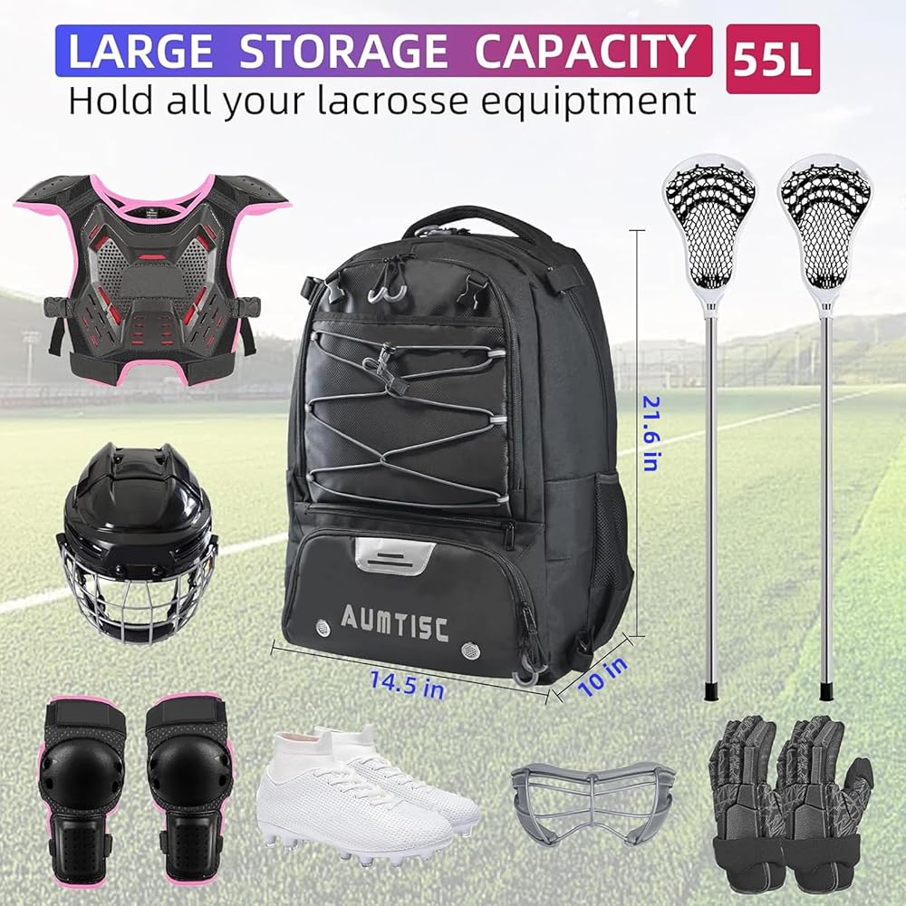Large Capacity : 55L lacrosse bag measured in 14.5" x 10" x 21.6" ; Fit for 2 lacrosse sticks, helmet / face mask, shoulder pads, arm / elbow pads, gloves, goggles, cleats and lacrosse equipment; Due to the large size, it is not recommended for use by those under 14 years of age