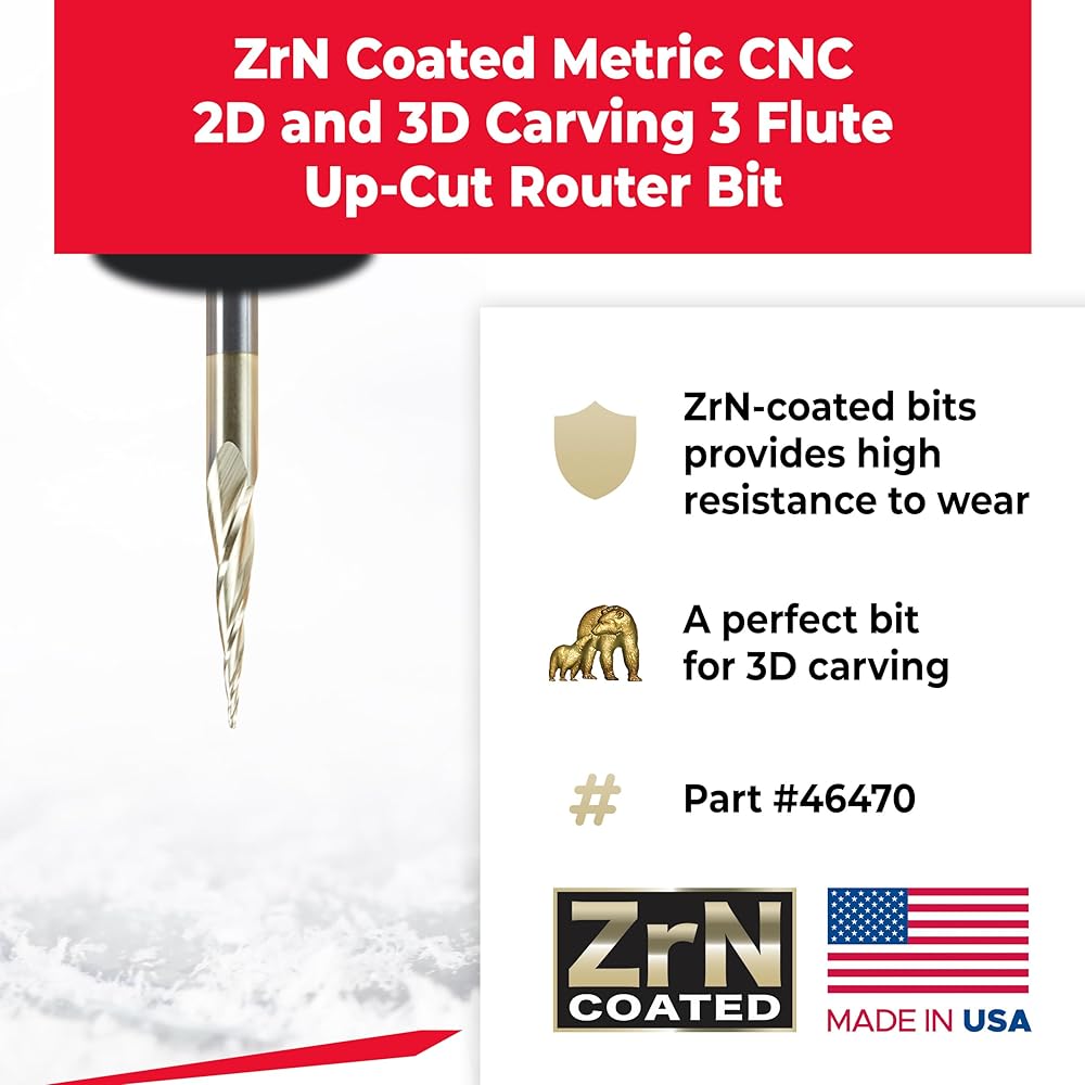 Specially designed for 2D and 3D CNC profiling and carving in plastic, aluminum & wood with CNC machines. The high-shear ball nose tips cut Smooth 2D and 3D contours with reduced stepping while the proprietary ZRN coating (applied by the physical vapor deposition coating process) provides high resistance to wear, sharper cutting edges, extended tool life and less friction and heat buildup. Some of Amana Tool carving tools, as you can appreciate have a very small diameter therefore any material chip-loads need to reflect that small size. It can however withstand RPM up to 60, 000 RPMs. A directed air-blast to keep chips away along with cooling the tool and work piece are always welcome. Tools are manufactured with high balance that allows them to run up to 60, 000 RPMs. Adjust your chip load and feed rate accordingly., #46470, (D) diameter 0.8mm, (R) radius 0.40mm, (a°) angle 6.2°, (b) Cutting height 25mm, (D) shank 6mm, Overall Length (L) 75mm, type ball nose, ZRN, flutes, 46470 CNC 2D and 3D carving 6.2 deg tapered angle ball tip x 0.8mm dia x 0.40mm radius x 25mm x 6mm Shank x 75mm long x 3 flute Up-cut spiral solid carbide ZRN coated