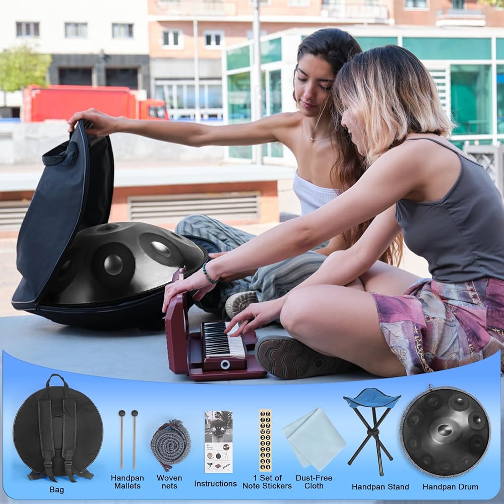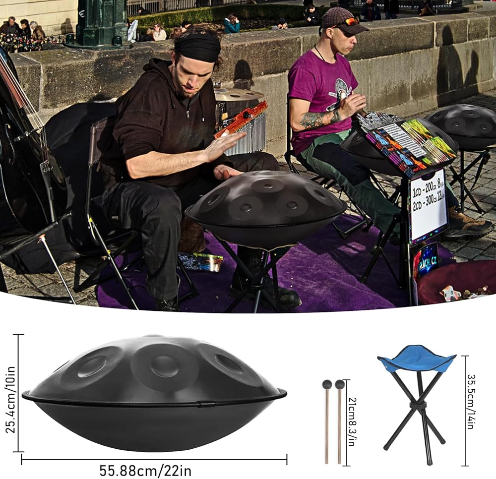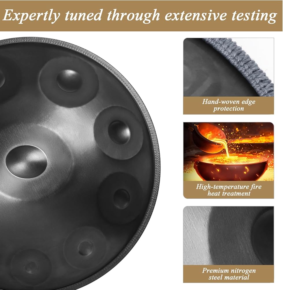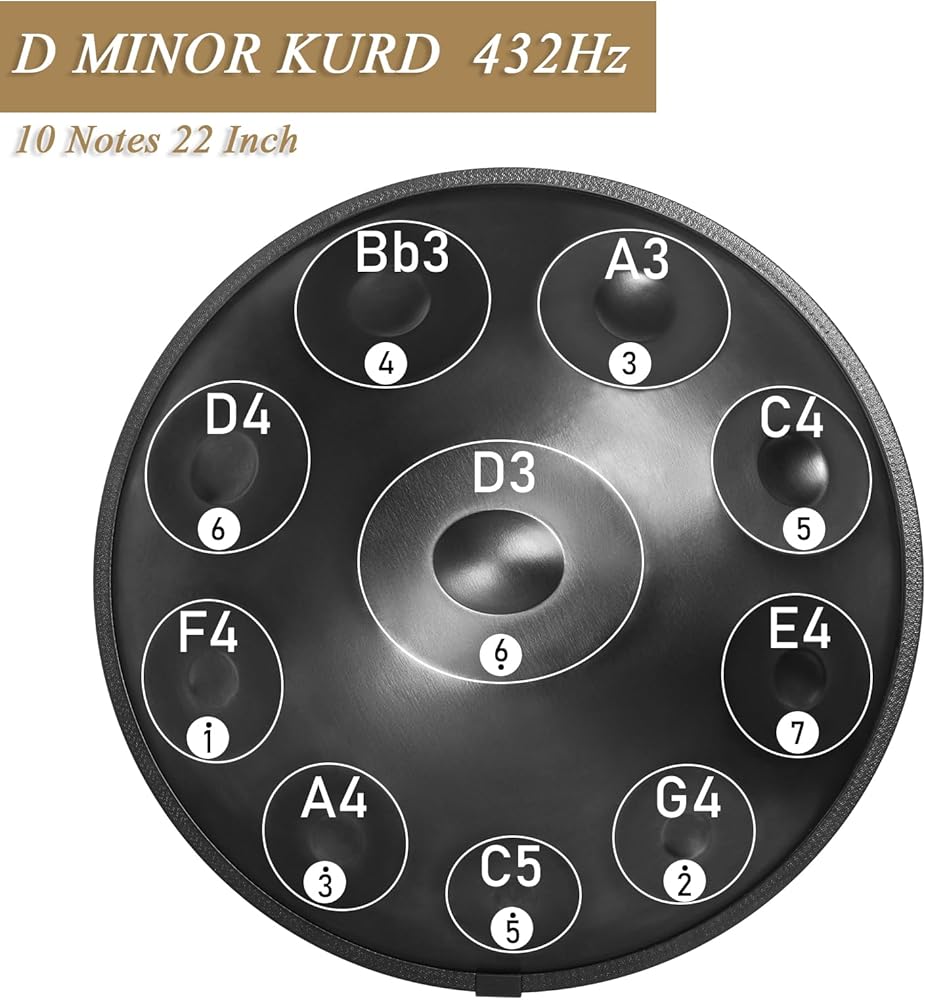 ملاحظة: الطبلة اليدوية لدينا مكتوبة بخط D طفيف، وتتضمن 10 نغمات (A3، Bb3، C4، D3، D4، E4، F4، G4، A4، C5). لا حاجة لأي معدات أخرى - ما عليك سوى النقر على الطبلة اليدوية بشكل إيقاعي بيديك لإنتاج ألحان آسرة.