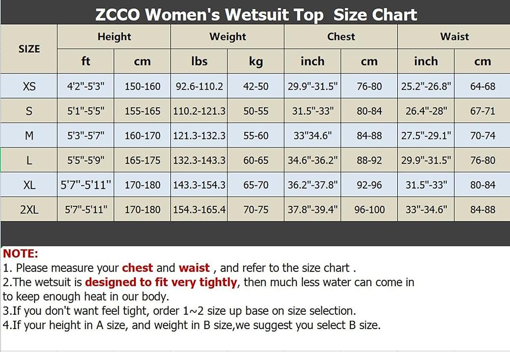 【اقتراح المقاس】بدلات النيوبرين مقاس 1.5 مم مصنوعة من مادة قابلة للتمدد ضيقة نسبيًا، وهي مصممة لتناسب ضيق قليلاً لتوفير أقصى قدر من العزل، ويجب أن تكون ملائمة بإحكام شديد عندما تجف وستكون فضفاضة عند غمرها. عند اختيار مقاسك، يرجى مطابقة طولك ووزنك وصدرك أولاً. إذا لم تكن متأكدًا من المقاس، فلا تتردد في الاتصال بنا.