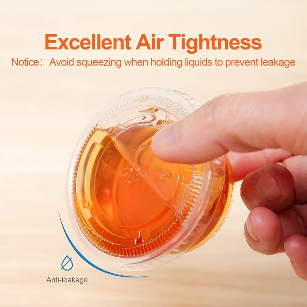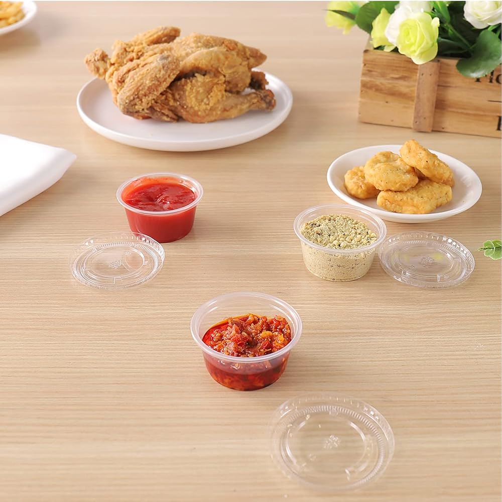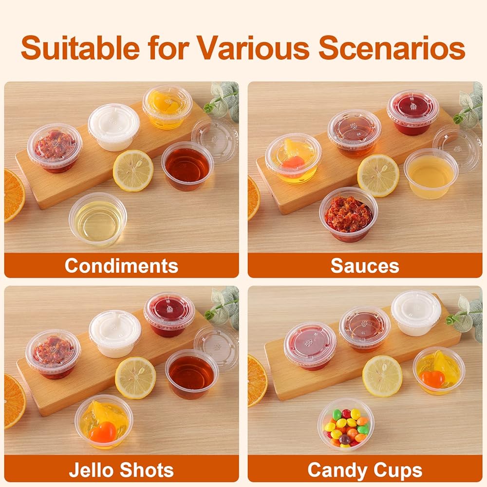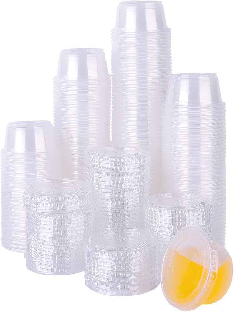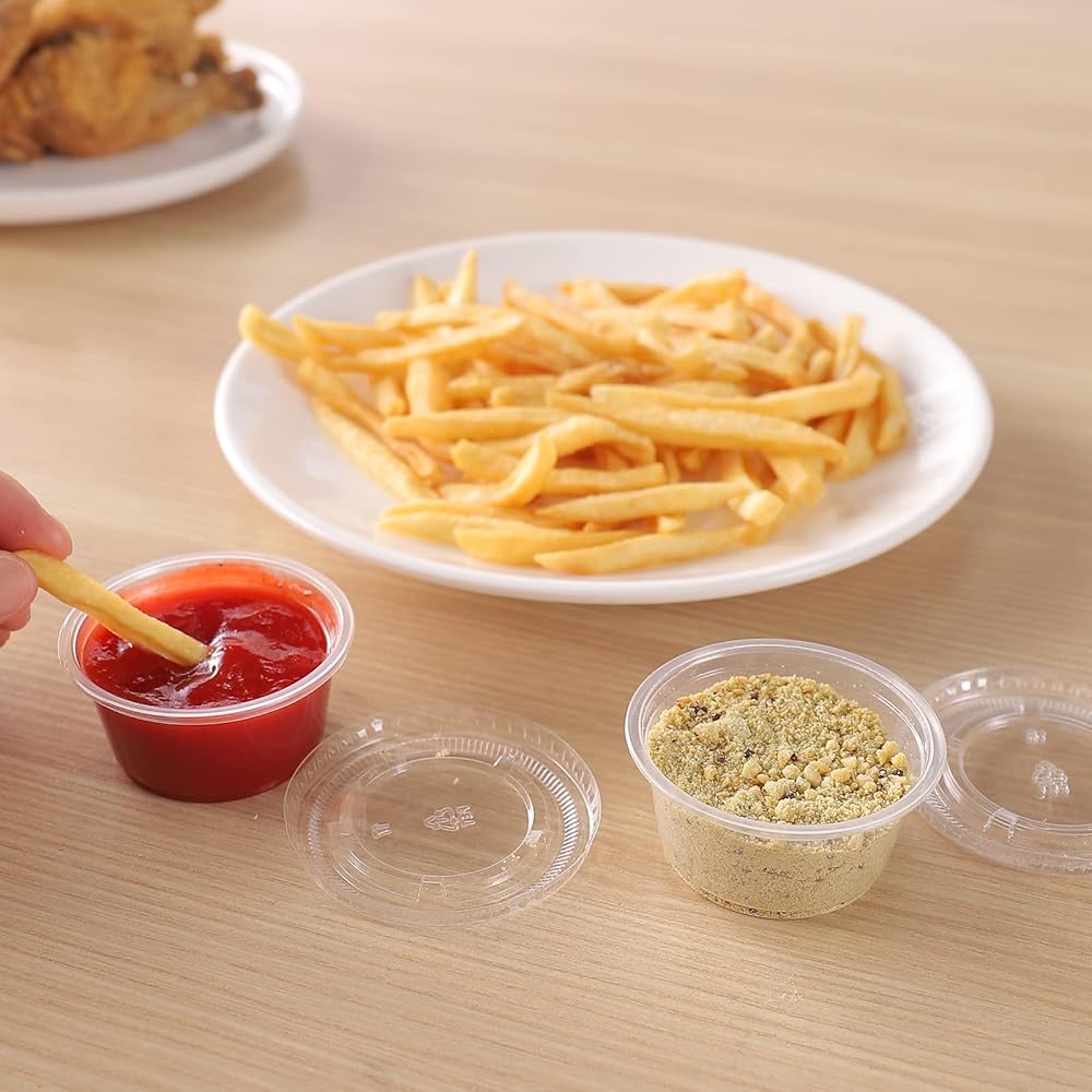 TashiBox 2 oz plastic portion cups with lids are the ideal solution for serving everything from condiments to whipped butter. Made from durable, crack-resistant, food-grade BPA-free polypropylene, these versatile soufflé cups are perfect for salad dressings, jello shots, dipping sauces, and food sampling. The airtight, leak-proof lids form a secure seal, keeping your food fresh in the fridge or freezer while preventing spills and messes. They're also great for carrying dressings or snacks in your lunchbox. This set includes 200 cups and lids, providing excellent value for use in kitchens, restaurants, food service, parties, and more. The clear design allows for easy identification of contents, adding a premium look to items like sauces, desserts, and jello shots, which can help boost impulse sales. Whether you're looking to control portions, reduce waste, or streamline meal prep for healthier eating, these portion cups are a practical and eco-friendly choice. Recyclable and efficient, they're perfect for portion control in foodservice, meal prep, or restaurant use, ensuring consistent servings of sauces, dressings, toppings, and more.