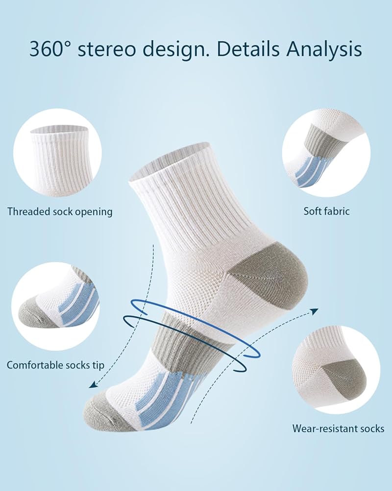 الأداء: تمتص الرطوبة بسرعة وتطردها، مما يحافظ على جفاف قدميك. تظل مادة الأداء ناعمة حتى بعد عدة غسلات، ويتناسب الشريط المطاطي بشكل مريح حول الكاحل والساق دون التسبب في أي إزعاج