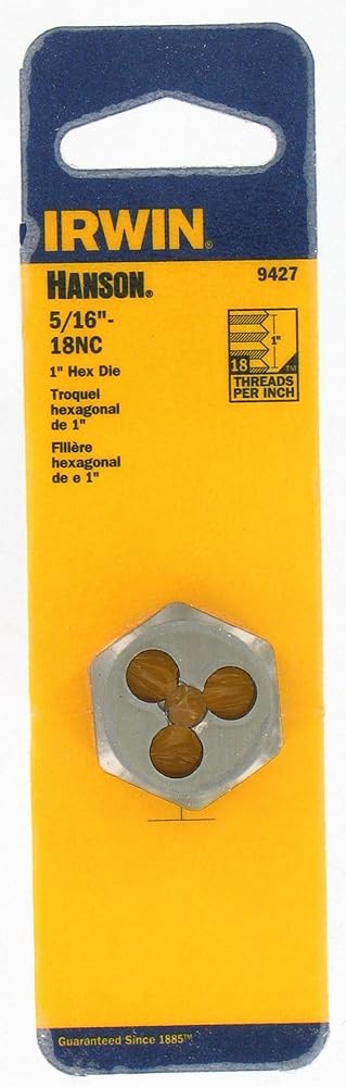 Irwin 9427 Hanson 5/16"-18 NC Thread 1" Hexagon Machine Screw Die (HCS) - 1" in flats. Ideal for maintenance and repair work. Recommended for use with hex die. Die can be used with a wrench or socket when space is limited. Advanced Die Geometry - Allows faster cutting with longer life. Material Type: High Carbon Steel (HCS) for cutting external threads by hand. Etched: Die size etched on each tool for easy identification.
