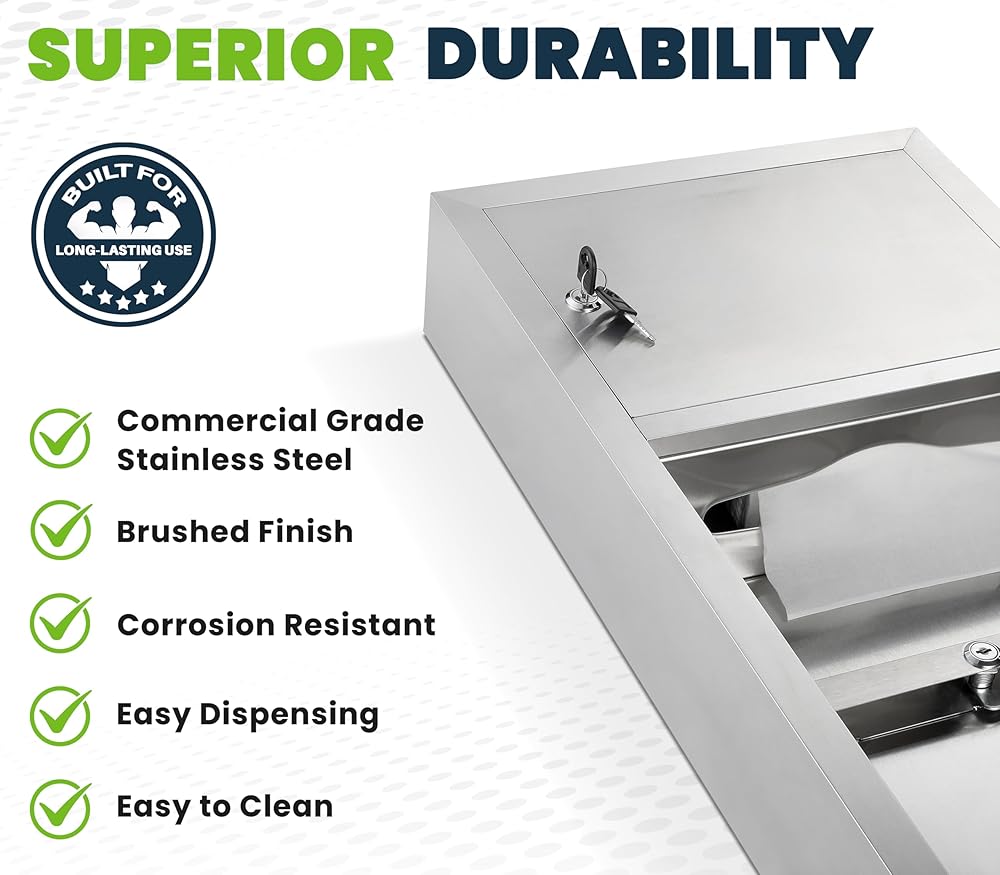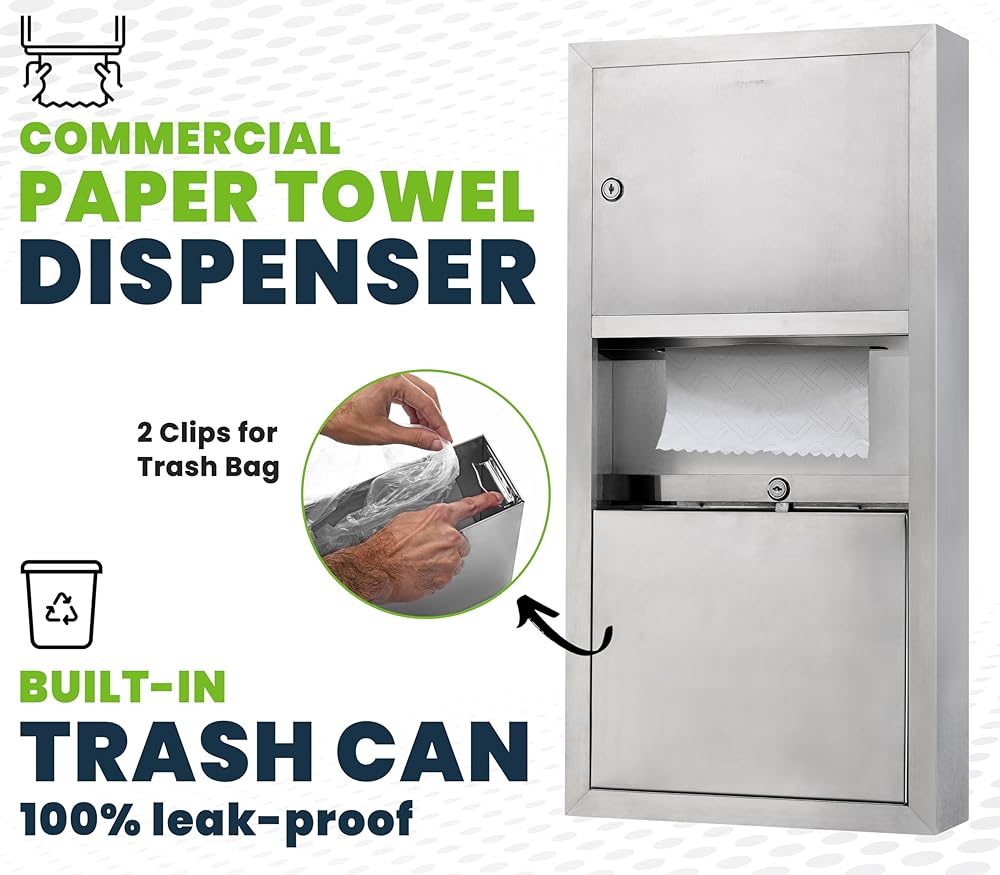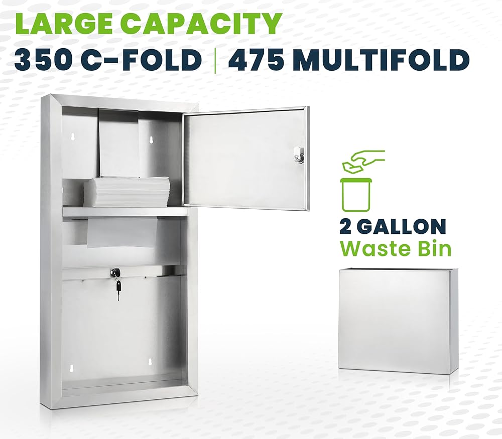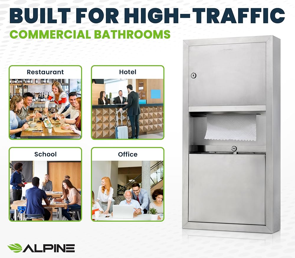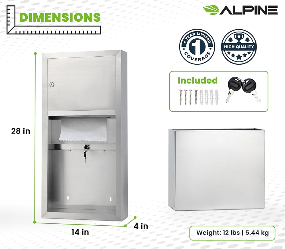 موزع المناشف الورقية التجاري المثبت على الحائط من جبال الألب مع سلة مهملات على الحائط سعة 2 جالون، من الفولاذ المقاوم للصدأ للطي C والمناشف الورقية متعددة الطيات وثلاثية الطي، لمسة نهائية مصقولة، قابلة للقفل للحمامات التجارية