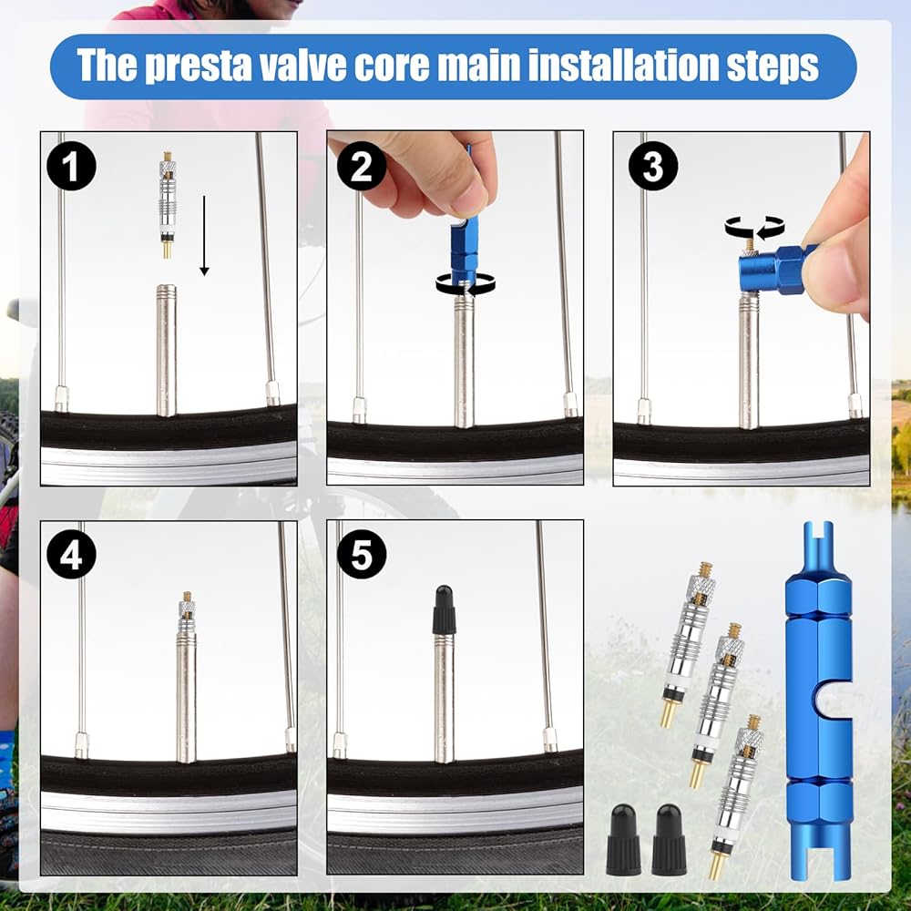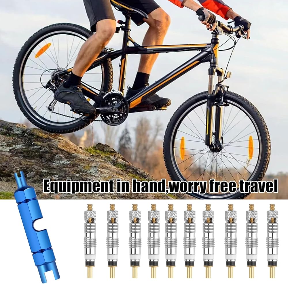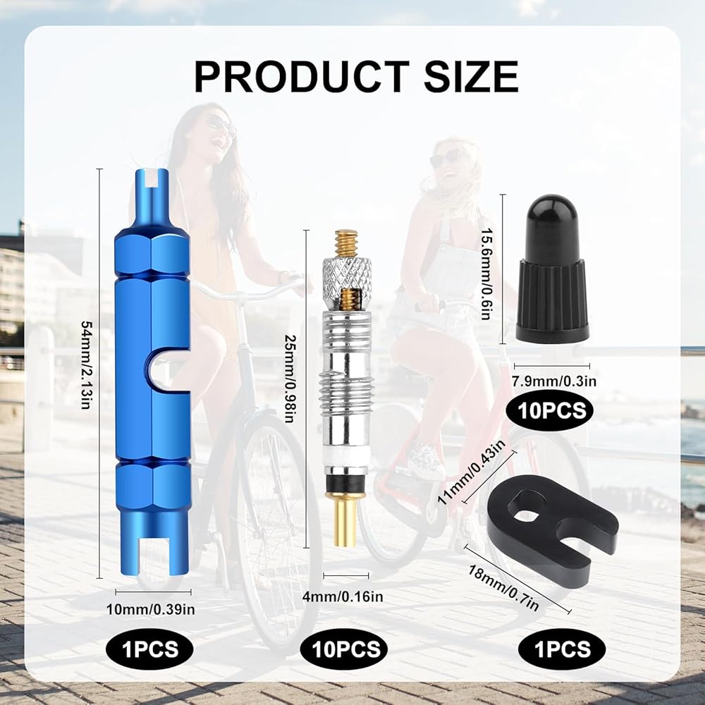 Package Includes: Includes 10 valve cores, 2 valve core removal tools, and 10 plastic valve core caps, providing a complete kit for bicycle use.Please note that our product isn't sponsored or endorsed by the brand it fits, including Presta.