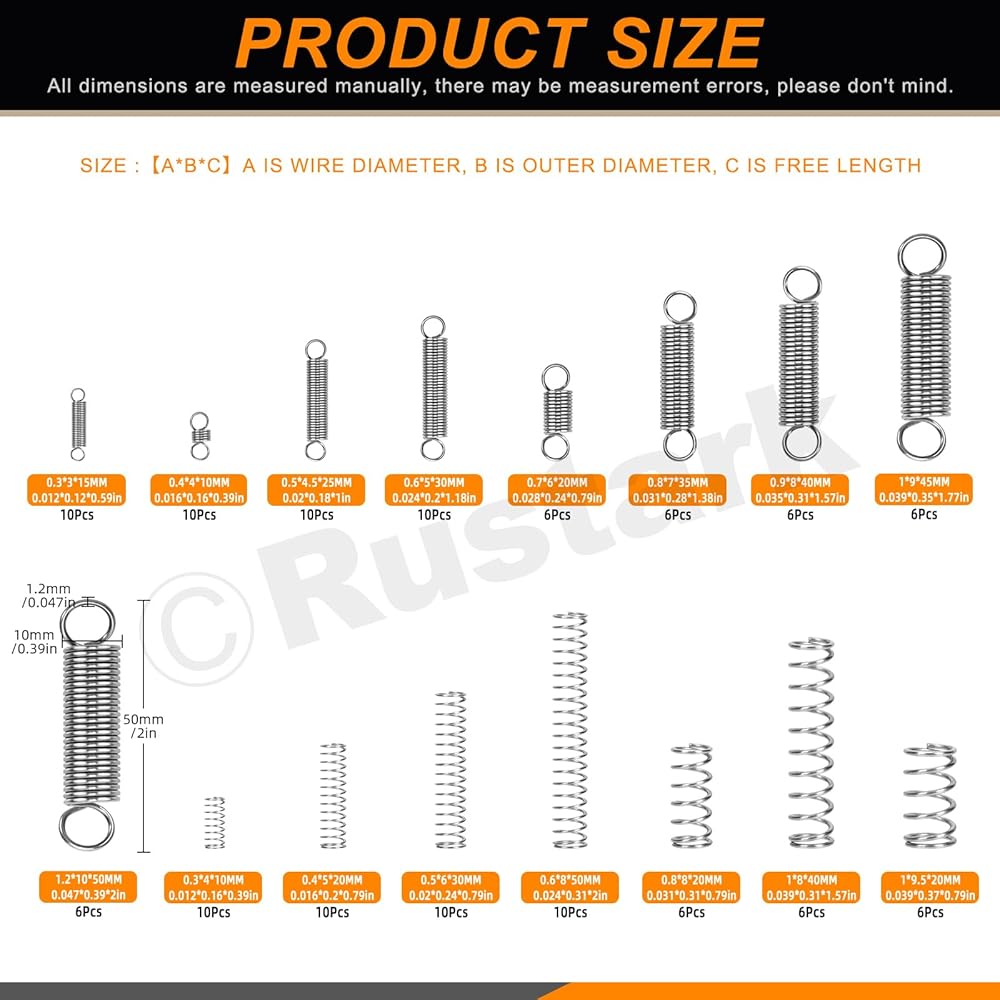 • 【 What You Get 】 --- You'll receive a 128pcs extension spring and compression spring assortment kit. The extension spring and compression spring come in 16 various sizes, including wire diameter in range of 0.012inch to 0.039inch (0.3mm to 1mm), and outer diameter in range of 0.12inch to 0.39inch (3mm to 10mm), overall length in range of 0.39inch to 2inch (10mm to 50mm). in total 128pcs. Sufficient quantity and wide range of sizes can meet your repair needs in daily life.