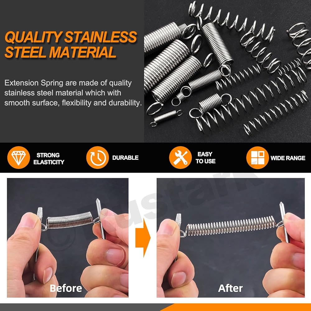 • 【 Easy To Use 】 --- The extended springs design features with double opening hook, which can be better fixed on the mechanical equipment easily to ensure the stable operation of the equipment. Compression springs are designed with flat end coils and feature strong spring rates. Besides, these mechanical springs in various sizes are packed neatly in a separate compartment in a transparent storage box, making it easy to get the right size you need.