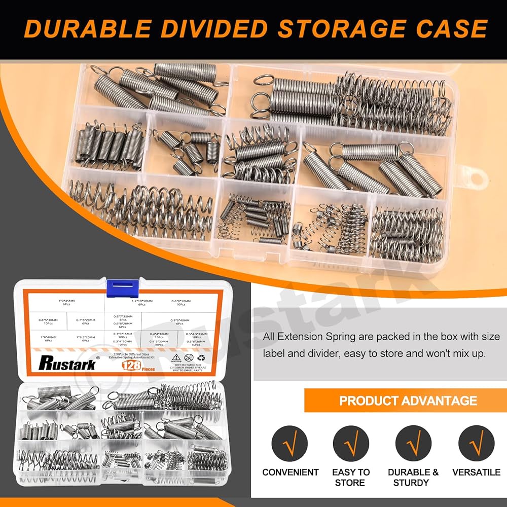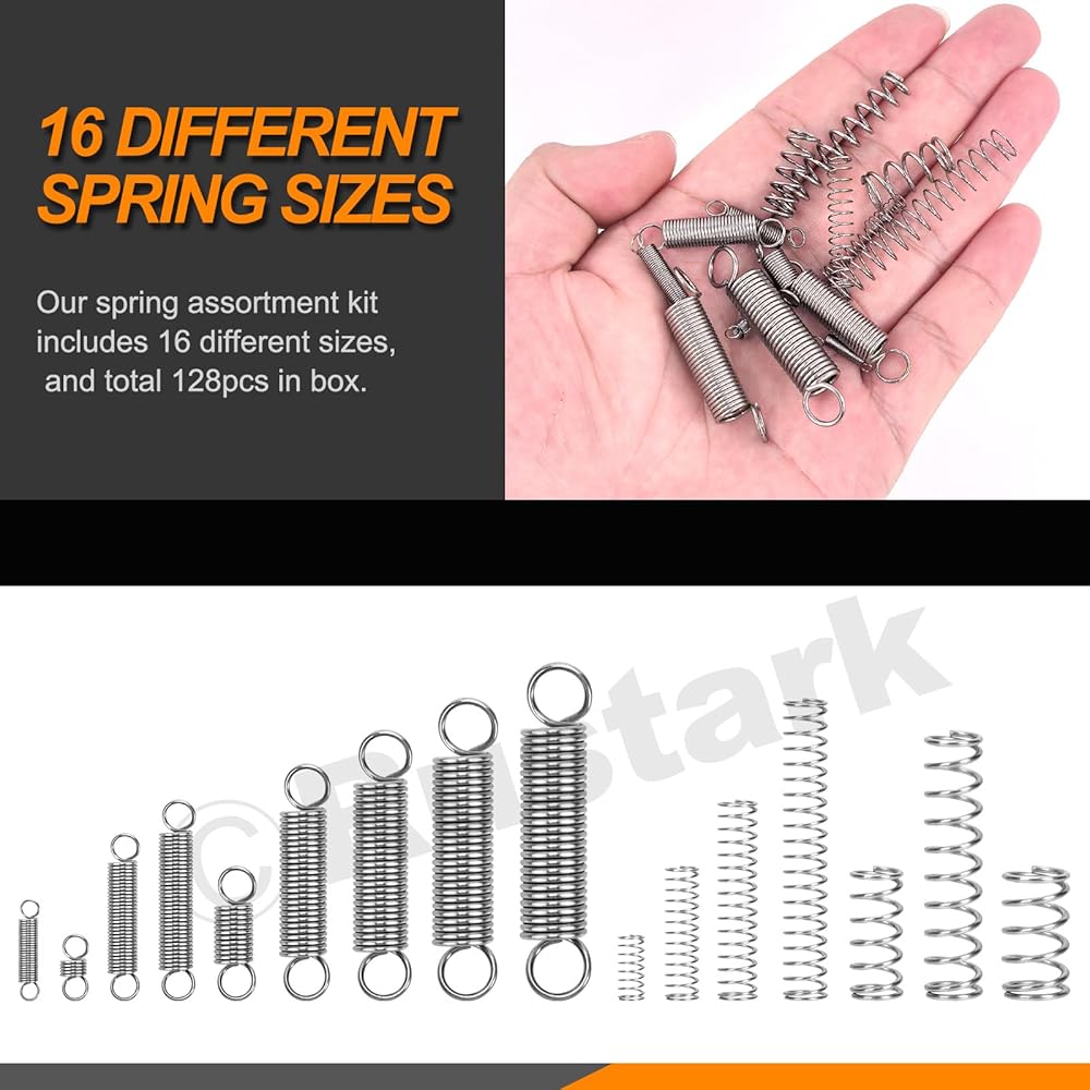 ★Rustark 128Pcs 16 Sizes Stainless Steel Extension Spring and Compression Spring Assortment Kit Mechanical Springs Small Spring with Hook End Tension Spring for Shop Home Repairs DIY