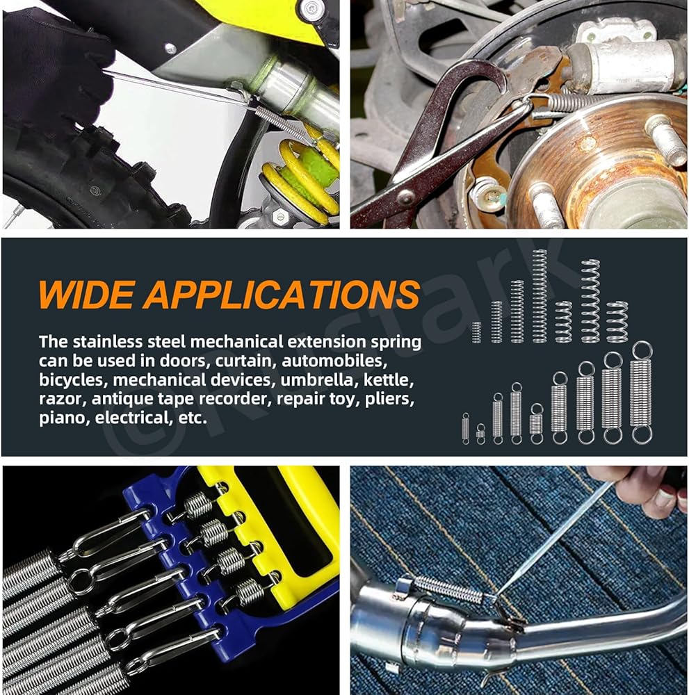 • 【 Wide Application 】 --- All the mechanical springs are widely applied to marine, toys, automotive, tools, doors, curtain, automobiles, bicycles, umbrella, kettle, razor, aircraft, antique tape recorder, repair toy, pliers, piano, scissors and so on. Suitable for construction, mechanical devices, electrical appliances, production and assembly, experiment, research and development, maintenance, home repair, etc.