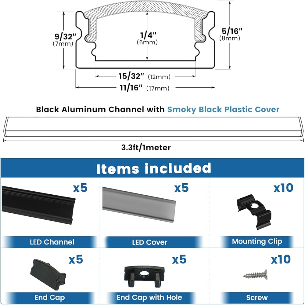 • تشتمل العبوة على: 5 قطع من غطاء قناة LED من الألومنيوم الأسود، 5 قطع من أغطية موزع الأشعة فوق البنفسجية باللون الأبيض الحليبي، 10 قطع من أغطية الأطراف، 10 قطع من مشابك التثبيت، 10 قطع من البراغي. يبلغ طول كل قطعة مبيت LED 1 متر (3.3 قدم)، وبالتالي فإن الطول الإجمالي هو 5 متر/16.4 قدم. يمكن قطع المسار والغطاء LED إلى أي أطوال. يرجى البحث عن Muzata LCU1 إذا كنت بحاجة إلى مشابك تثبيت وأغطية نهائية إضافية، ابحث عن MUZATA LC03 إذا كنت بحاجة إلى موزعات ألوان أخرى