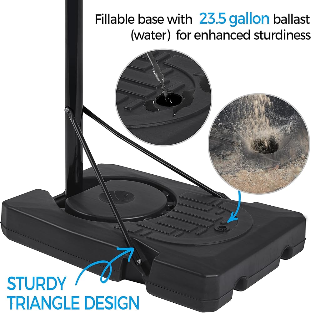 قاعدة قابلة للتعبئة على العجلات: توفر القاعدة الموزونة المتينة إلى جانب عجلتين كبيرتين طريقة عملية وسهلة للمناورة بنظام طوق كرة السلة هذا. يمكنك ملء القاعدة بالماء أو الرمل لمزيد من الأمان والثبات