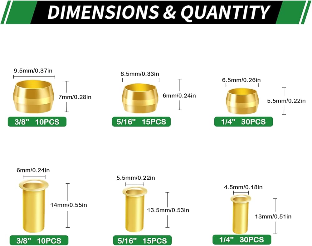 • مقدمة: تعتبر حلقات الأكمام المضغوطة النحاسية مناسبة للقطر الخارجي (1/8"، 1/16"، 1/4"، 5/16"، 3/8"، 1/2") للأنابيب ويمكن أن تكون تستخدم للأنابيب البلاستيكية أو النحاسية أو النحاسية أو الألومنيوم.