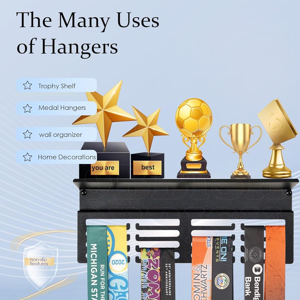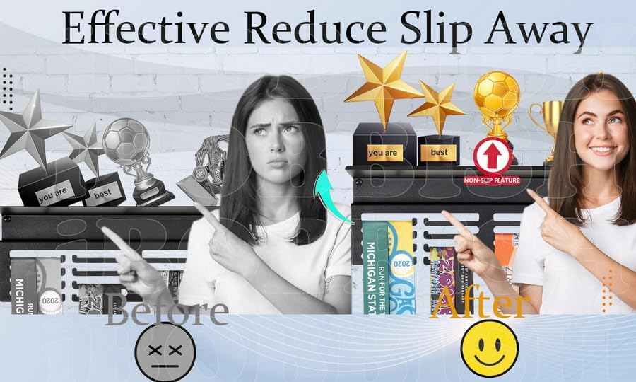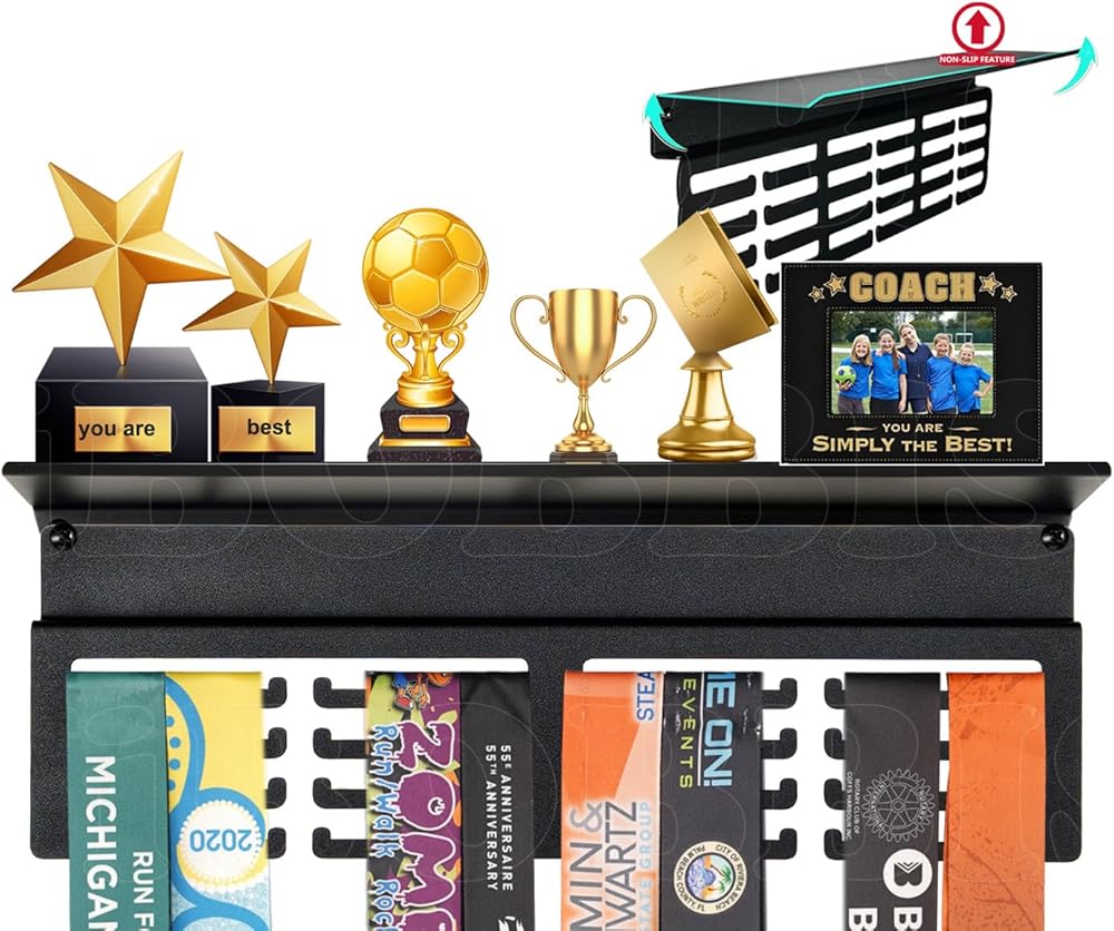 【ميزات غير قابلة للانزلاق】تصميم جديد ومحسن يختلف عن عرض شماعات الميداليات العادية مع رف في السوق. يحتوي رف عرض الكأس والميداليات على 4 صفوف من الشماعات مع سدادات. رف تروفي مطور مع شريط رف إضافي غير قابل للانزلاق، يمكنه حماية منطقة رف جوائز تروفي من الانزلاق أو السقوط. الأبعاد: 16 بوصة طول × 4 بوصة عمق؛ رف الكؤوس لتصميم الحائط يبدو نظيفًا، ليبقيك متحفزًا بعد كل إنجاز. اعرض ميدالياتك وكأسك بكل فخر