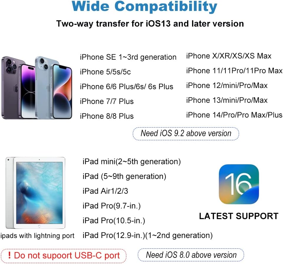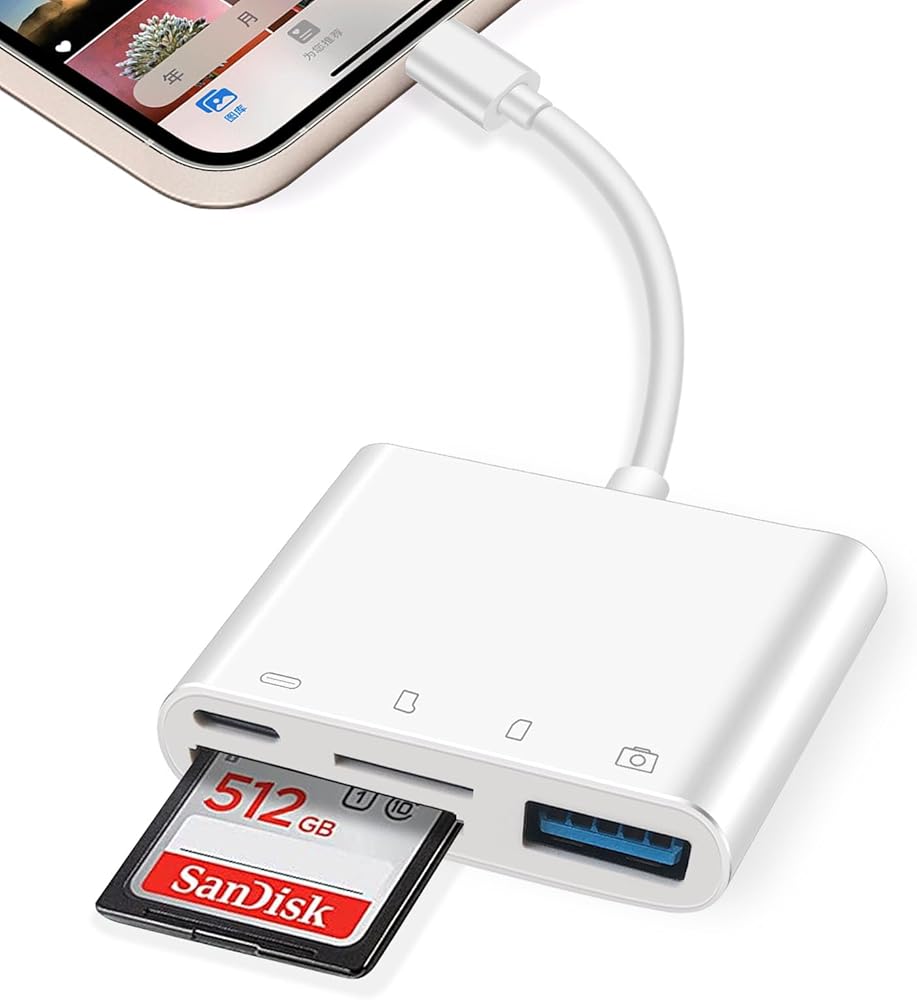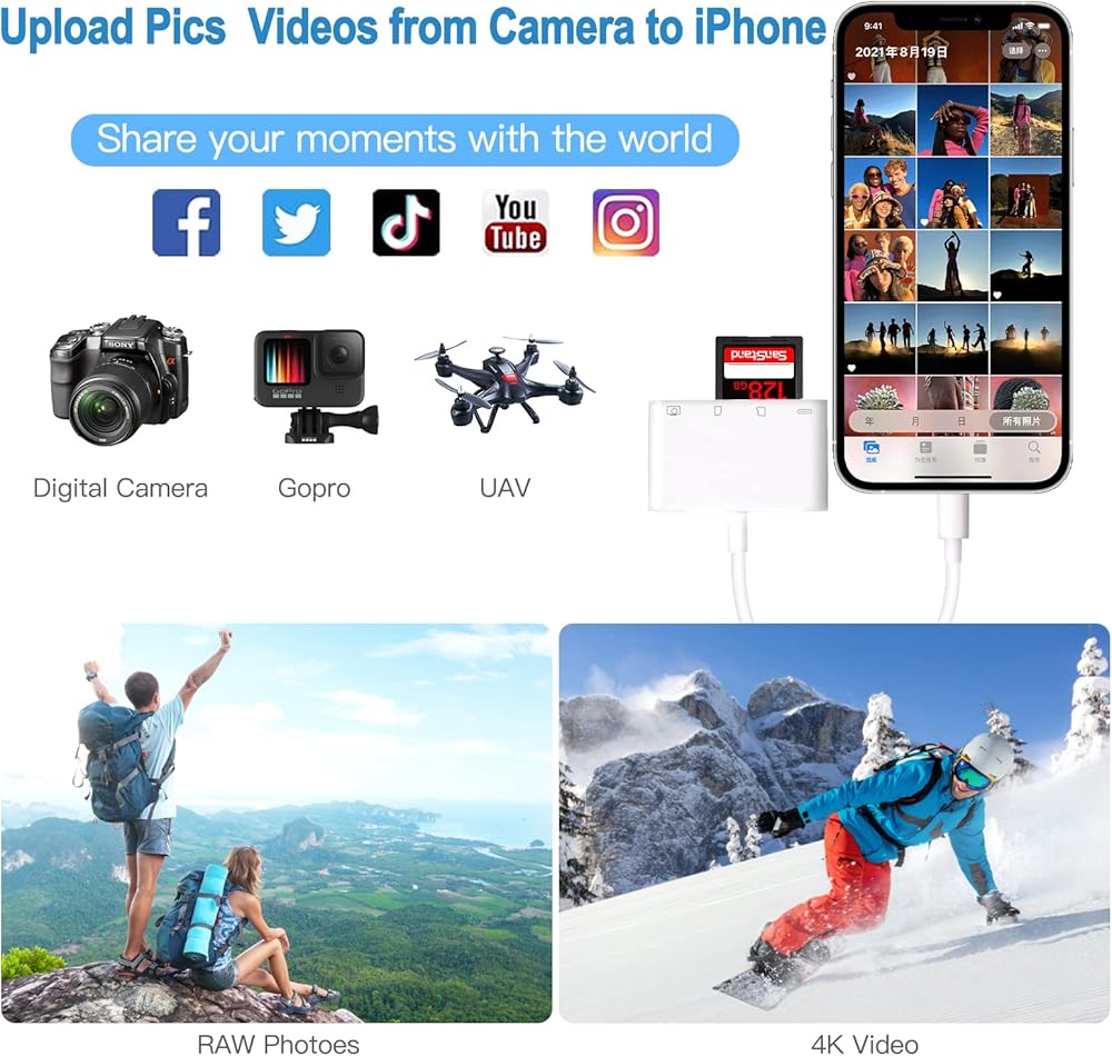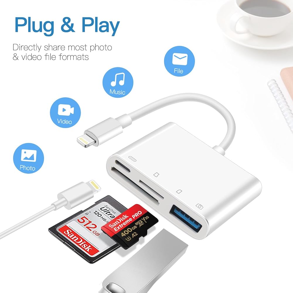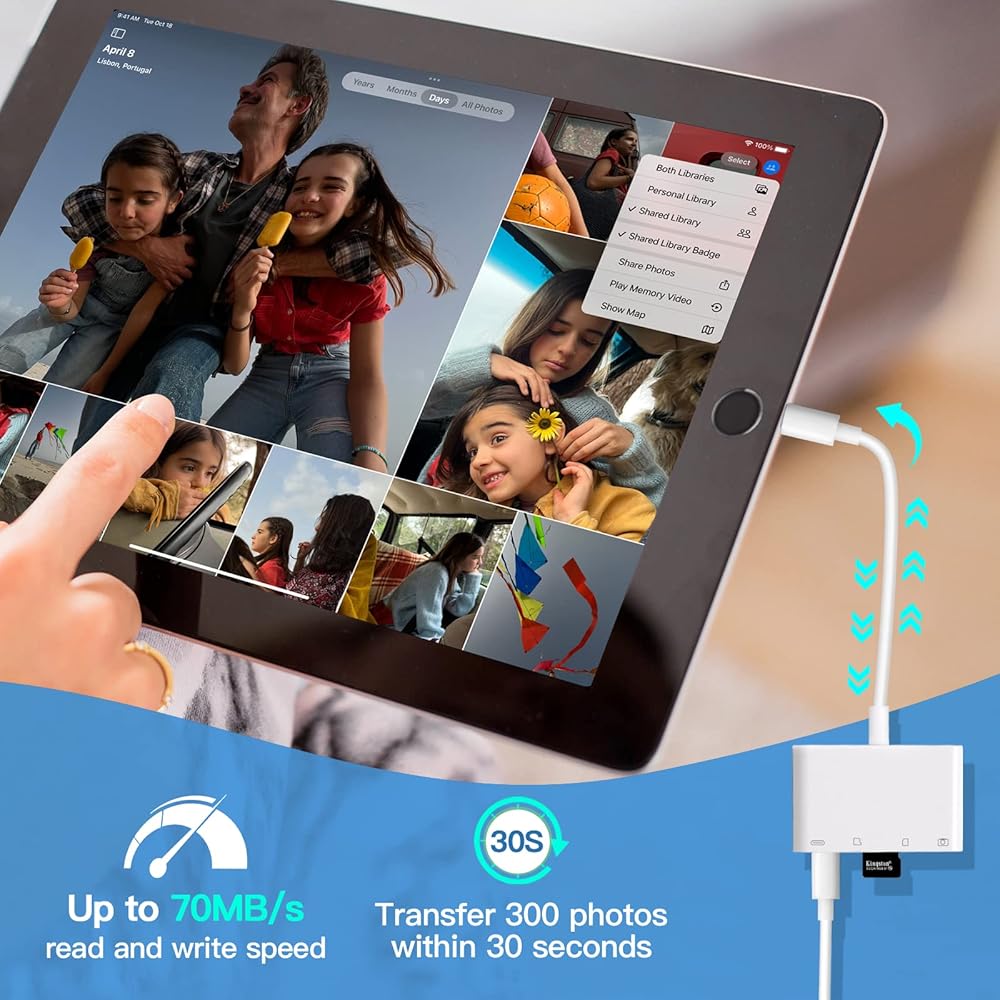 • التوصيل والتشغيل: لا حاجة إلى تطبيق، يرجى الانتظار لمدة 3 5 ثوانٍ بعد الاتصال بجهازك ثم تنزيل الصور والفيديوهات من بطاقة SD إلى جهاز iPhone & iPad مباشرةً.