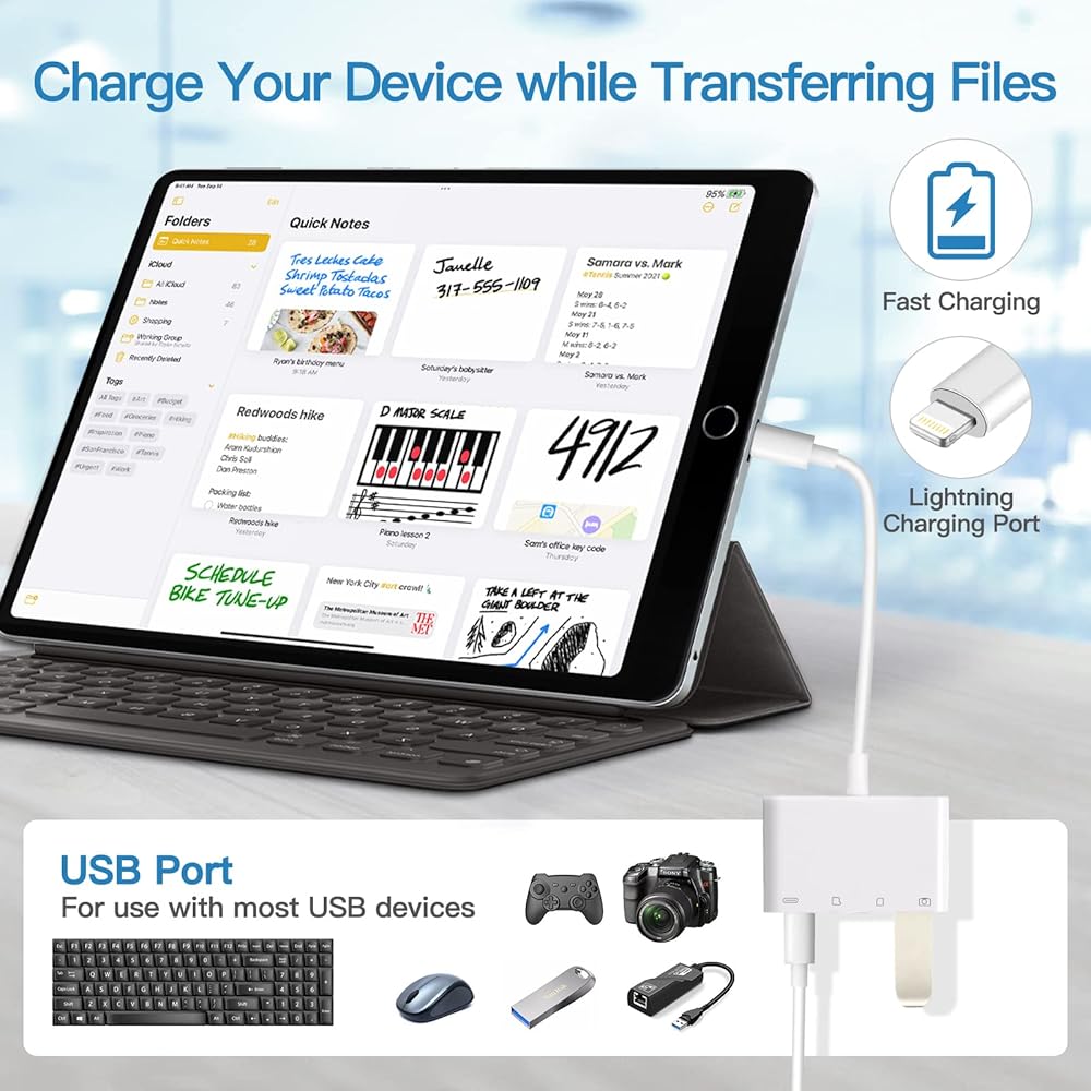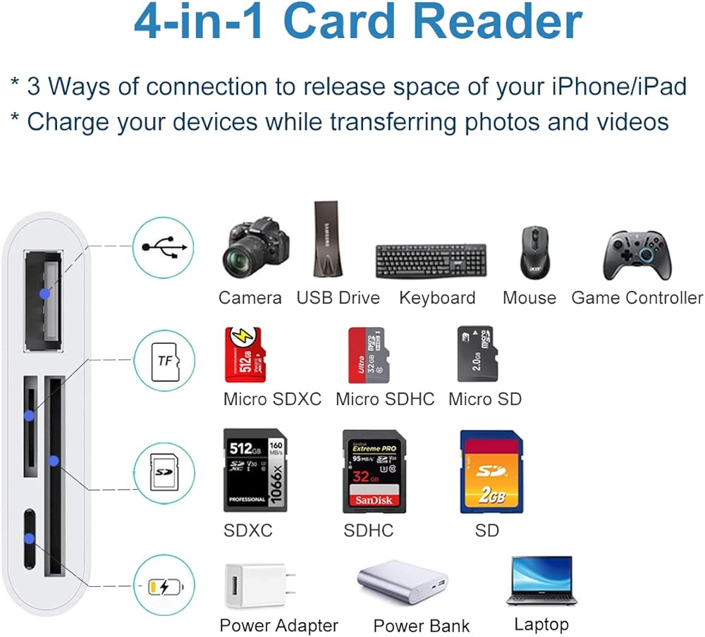 • قارئ بطاقات اس دي 4 في 1: 1 × فتحة بطاقة اس دي، 1 × فتحة بطاقة مايكرو اس دي (تي اف)، 1 × منفذ إمداد الطاقة، 1 × منفذ يو اس بي 2.0 أنثى لتوصيل المحاور ولوحات المفاتيح والكاميرات عند الدردشة أو الكتابة مع جهاز ايفون أو ايباد الخاص بك، ويمكنه شحن ايفون/ايباد الخاص بك في وقت واحد. يمكن أن يعمل موصل الكاميرا لايتننج يو اس بي هذا مع تيار يصل إلى 500 مللي أمبير.