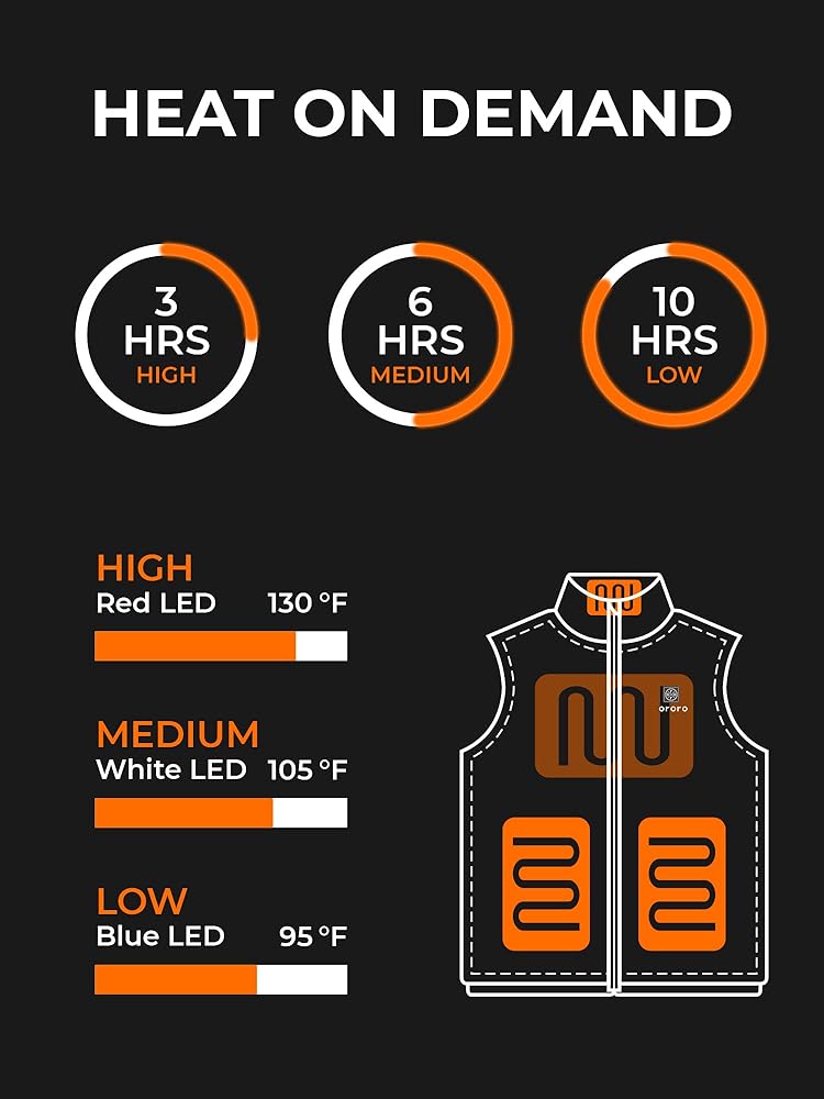 - Vest: Up to 10 working hours (3 hrs on high, 6 hrs on medium, 10 hrs on low heating setting)
