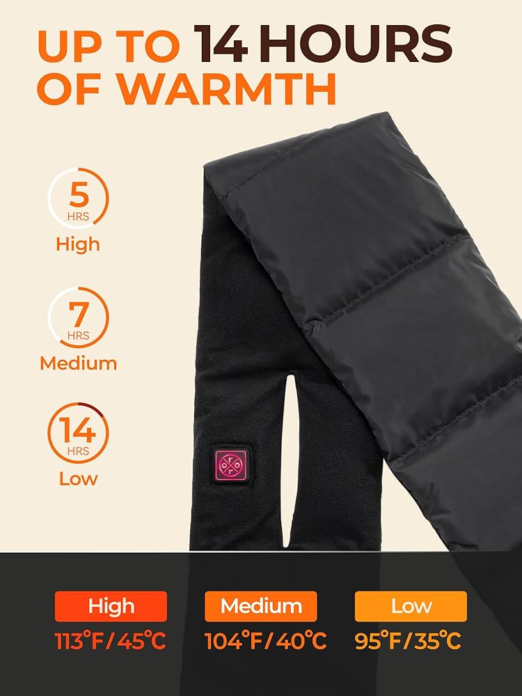 - Scarf: Up to 14 working hours (5 hrs on high, 7 hrs on medium, 14 hrs on low heating setting)
