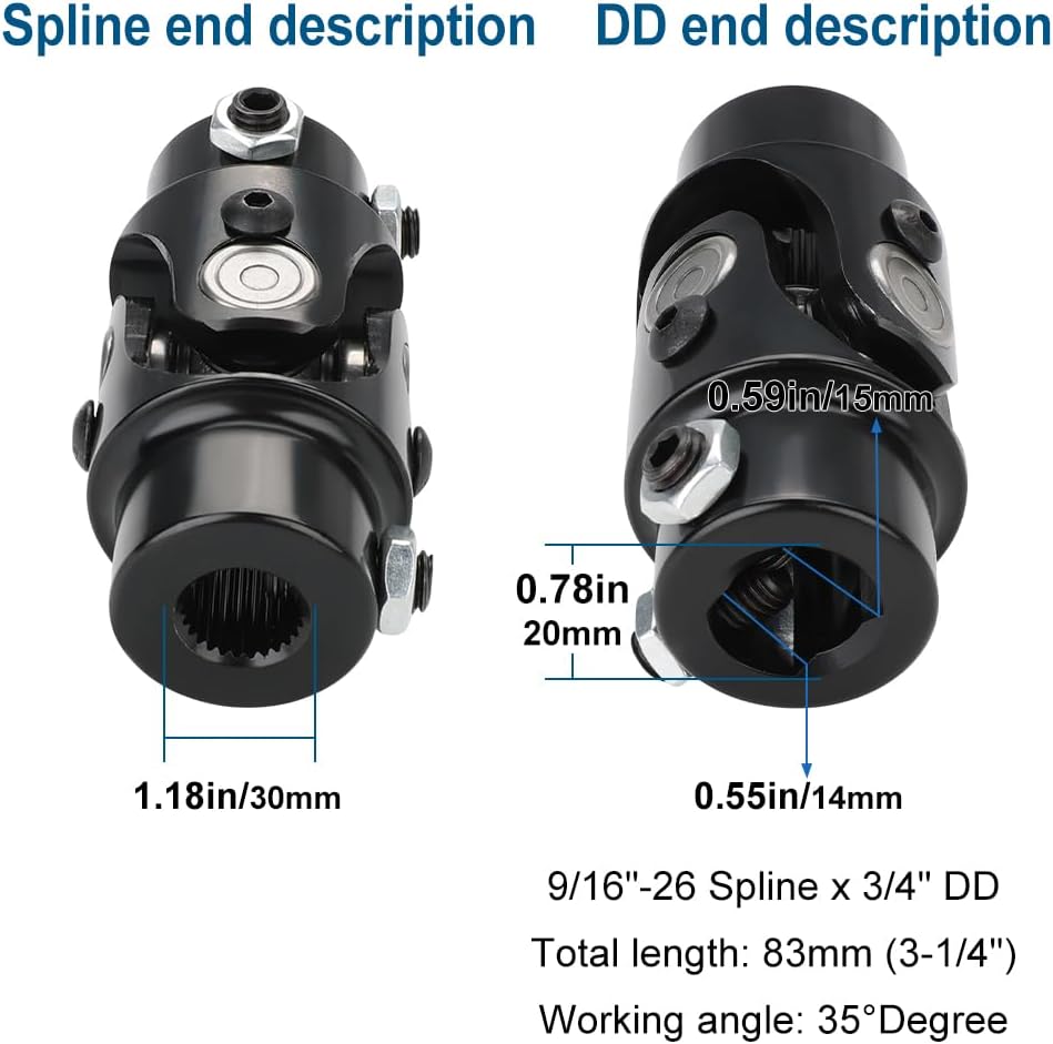 Steering universal joint, 9/16 -26 Spline x 3/4 DD, total length: 83mm (3-1/4"), working angle: 35°degree, rotational/ operating speed: 4000rpm.