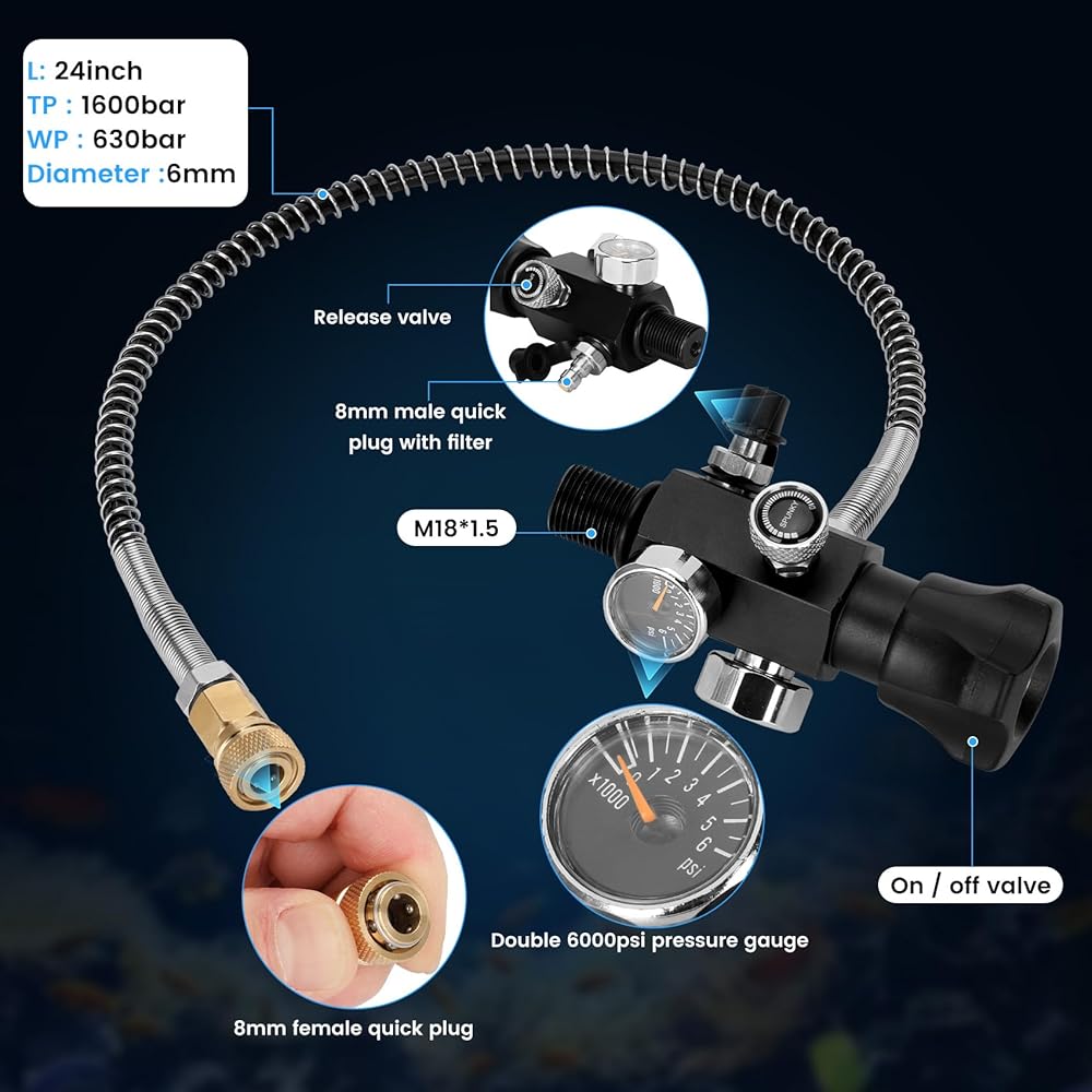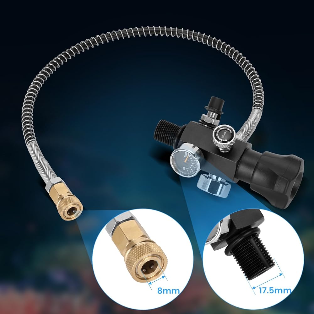 【Easy Use】 The valve scuba adapter comes with an 8mm standard female quick-disconnect coupling plug, and it could be connected and quick released from other male fittings within seconds