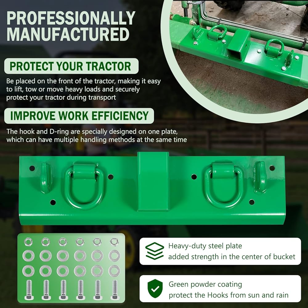 【Protect Tractor & Improve Work Efficiency】The Compact Tractor Grab Hooks are placed on the front of the tractor, making it easy to lift, tow or move heavy loads and securely protect your tractor during transport. The hook and D-ring are specially designed on one plate, which can have multiple handling methods at the same time, greatly improving work efficiency.