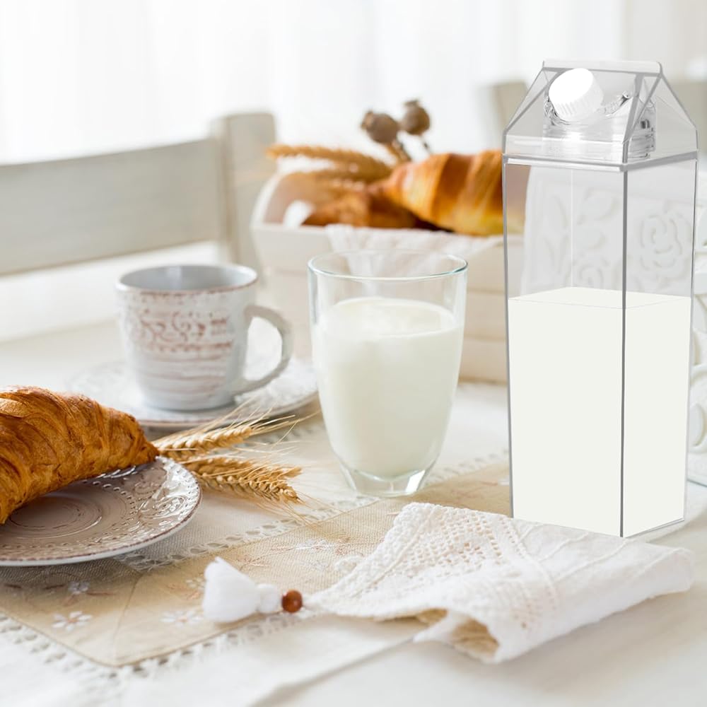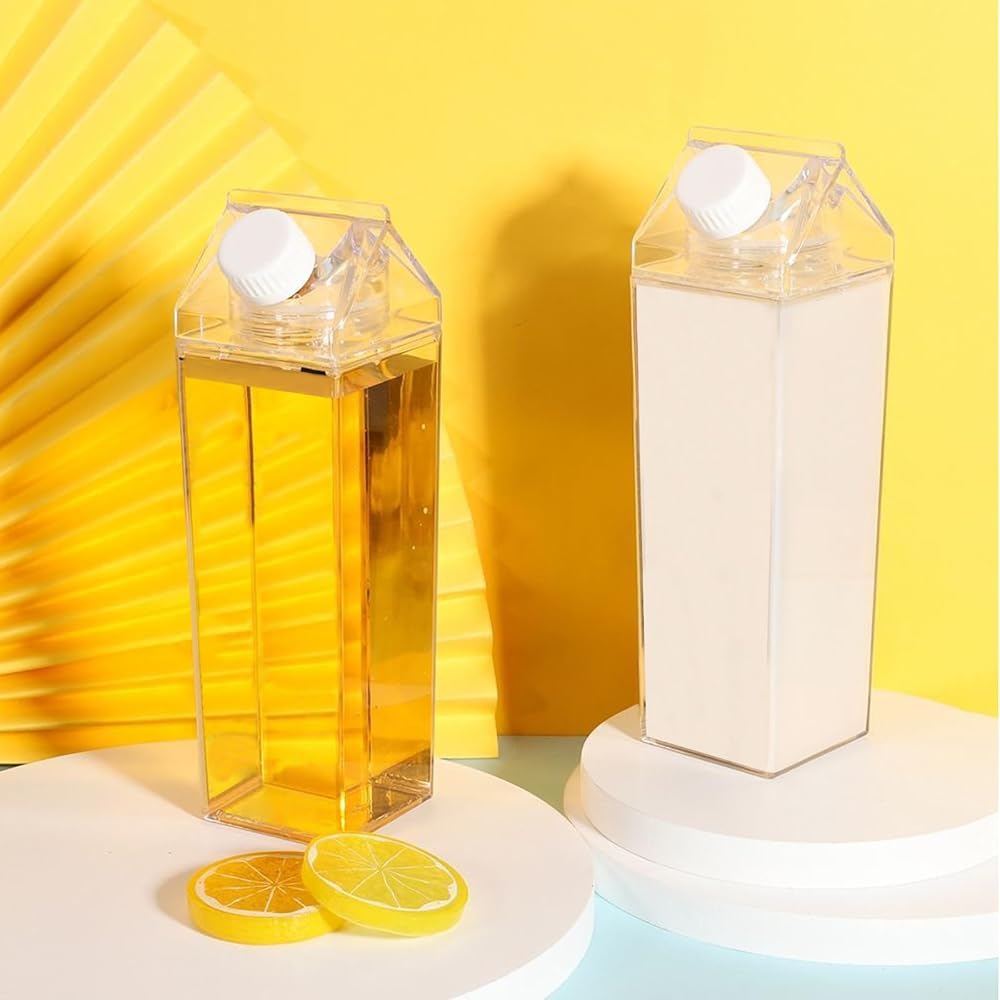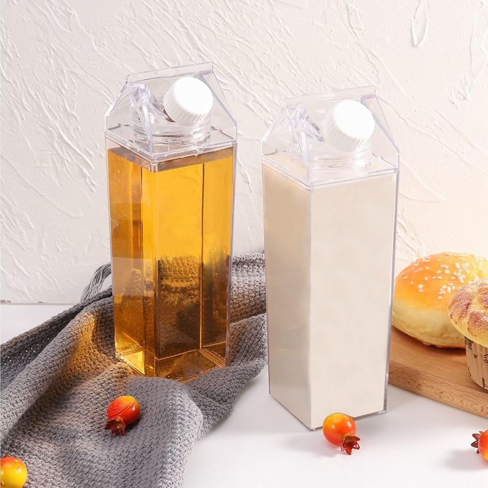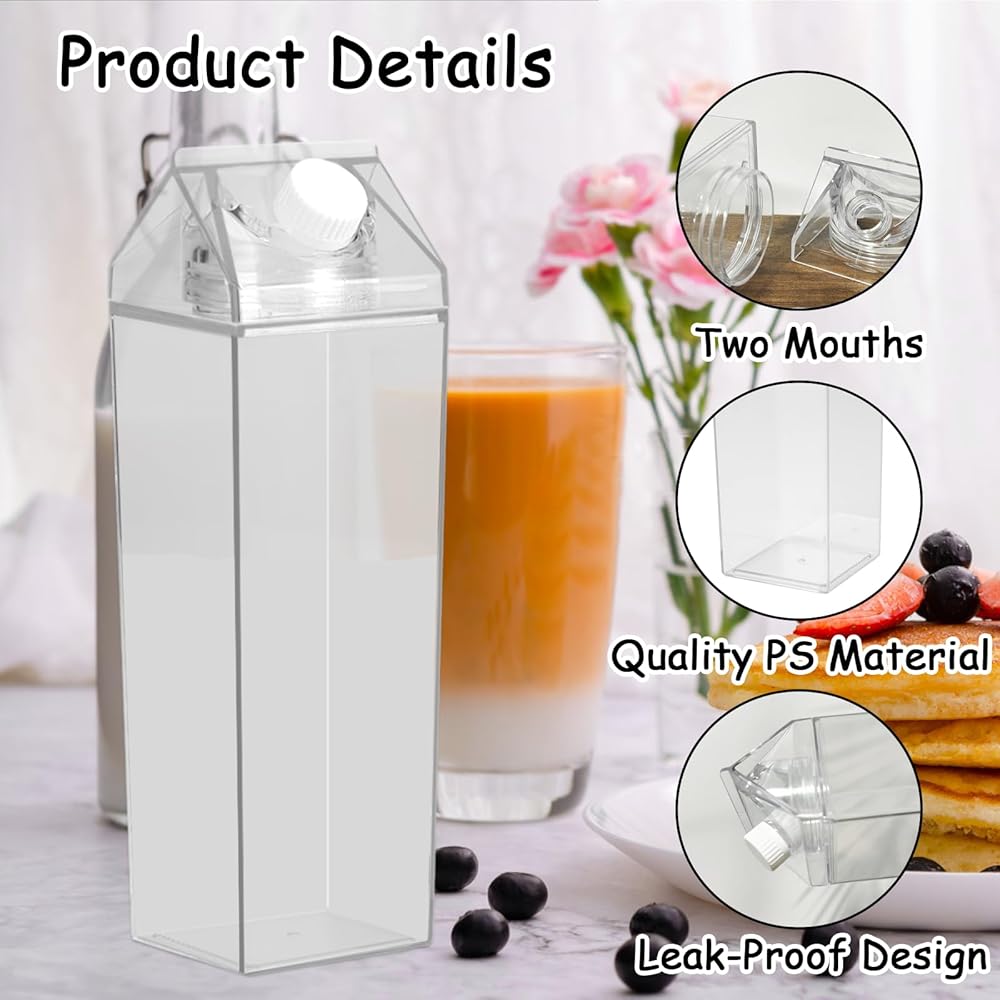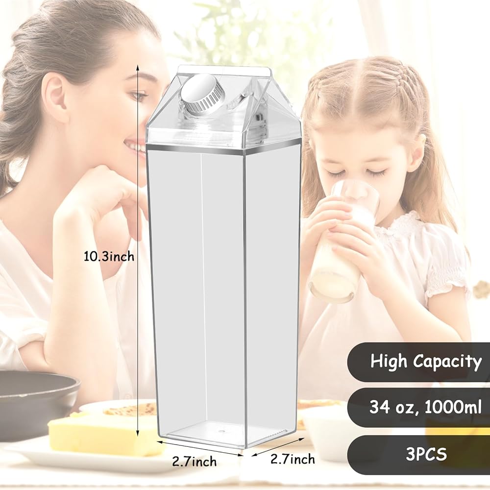 Appropriate Size: The clear milk carton water bottle measures 3.1''L x 3.1''W x 8.2''H with a capacity of 34 oz/1000ml, compact and lightweight, easy to fit in backpacks, book bags, car cup holders, refrigerators