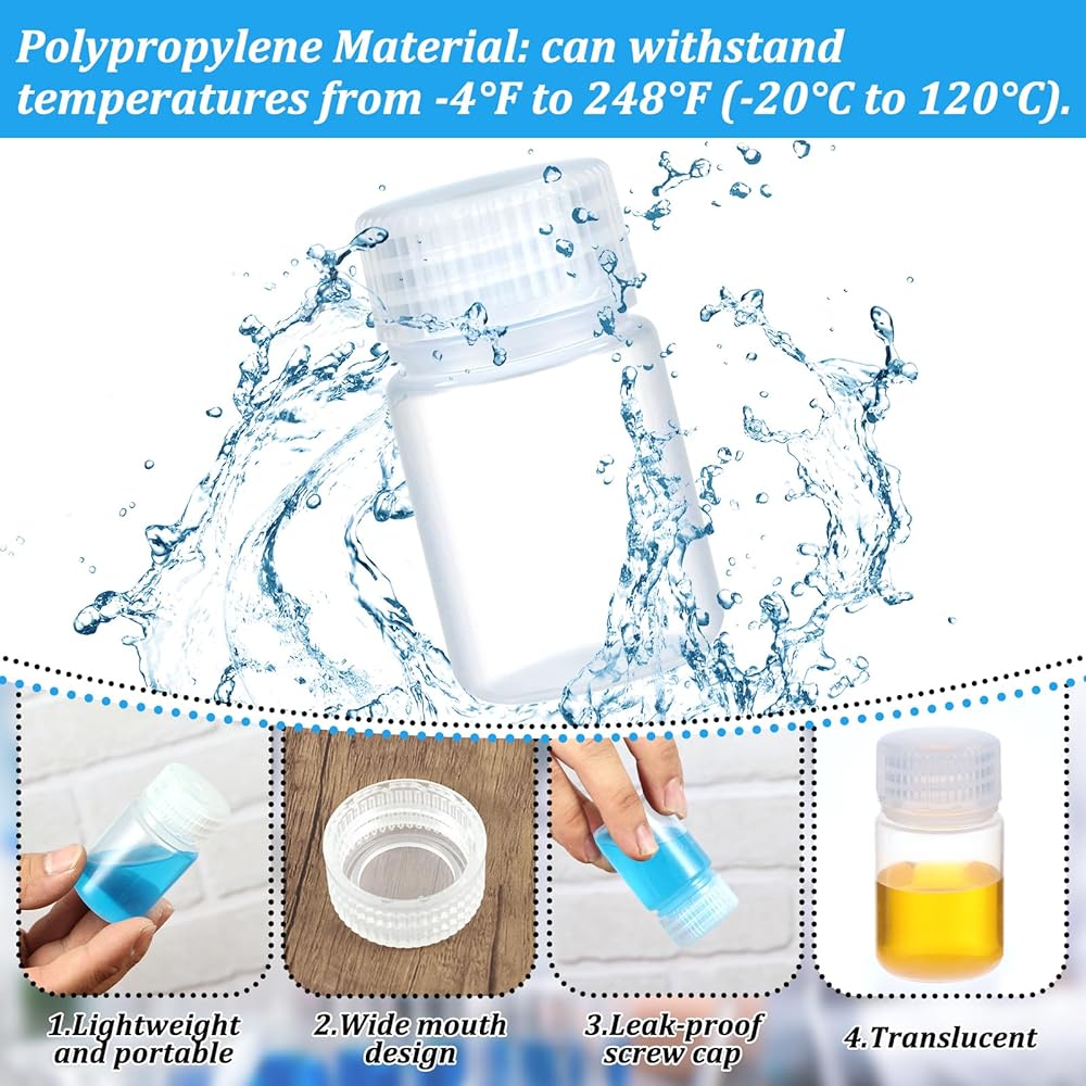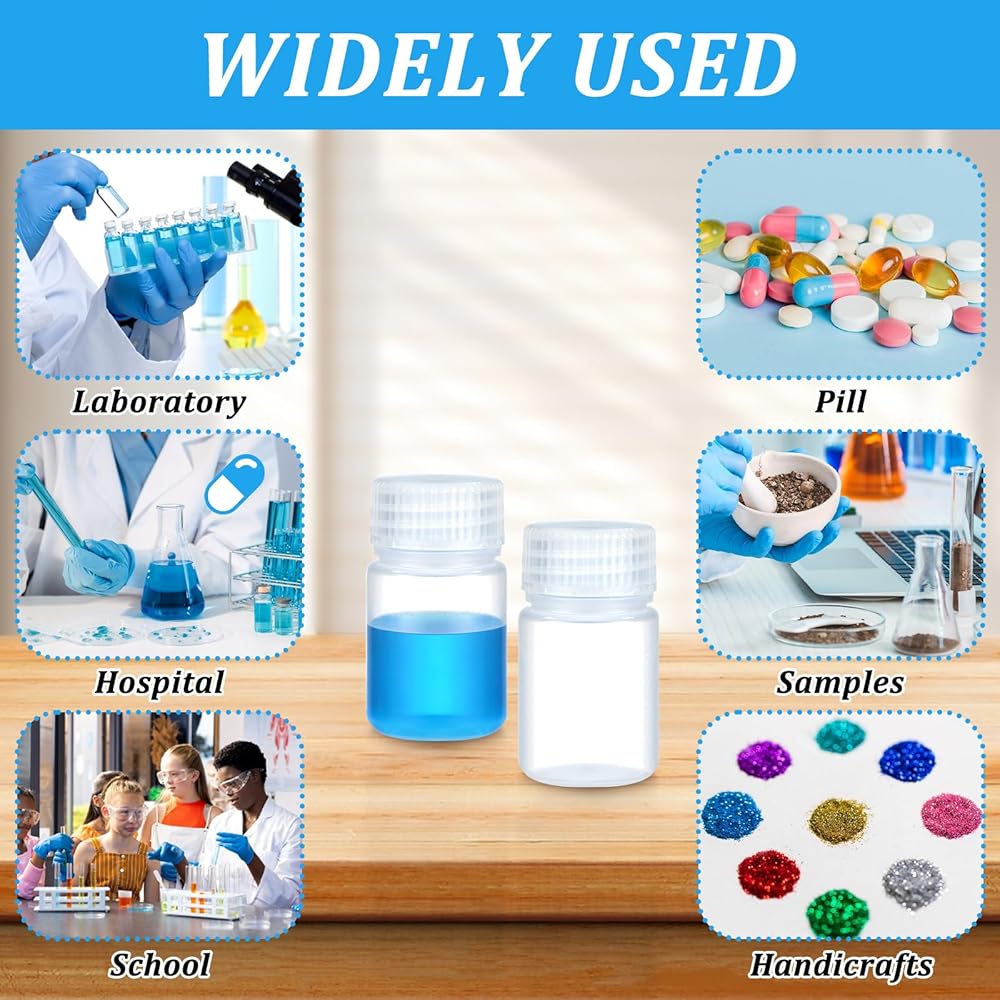 Wide-Mouth Design for Easy Pouring – The wide opening of these sample containers bottle makes filling and pouring liquids or powders simple and precise, minimizing spills and reducing mess on lab benches or classroom tables.