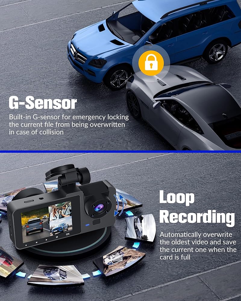 【كاميرا أمامية وخلفية مزدوجة بدقة 4K】يعمل مستشعر G المدمج على قفل الفيديو الحالي للحفاظ على الأدلة عندما تكتشف السيارة هزة/تصادم. حتى إذا كانت بطاقة SD ممتلئة، ستقوم كاميرا لوحة القيادة تلقائيًا باستبدال الفيديو القديم (غير المقفل) بأحدث فيديو. تحقيق تسجيل حلقة سلسة.