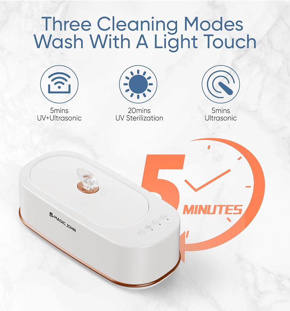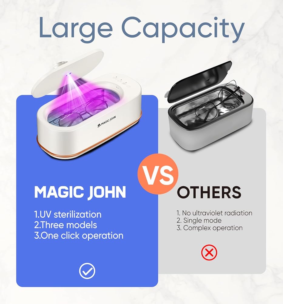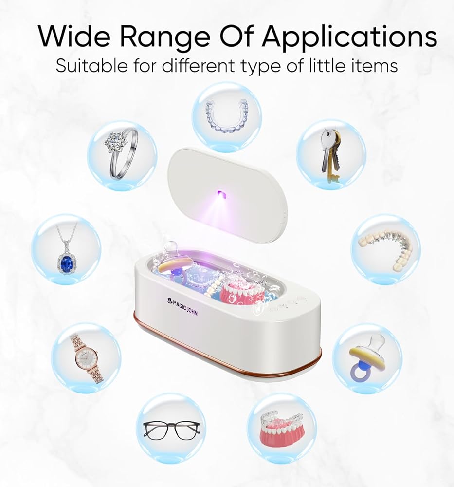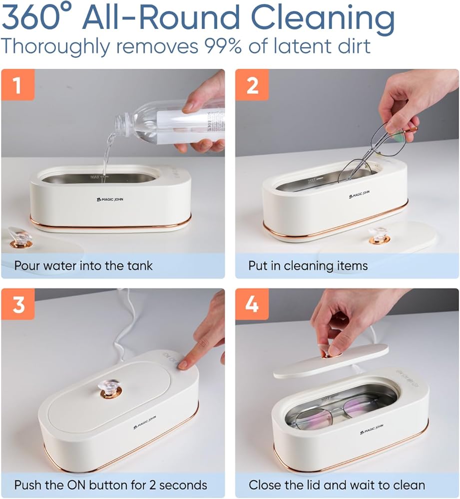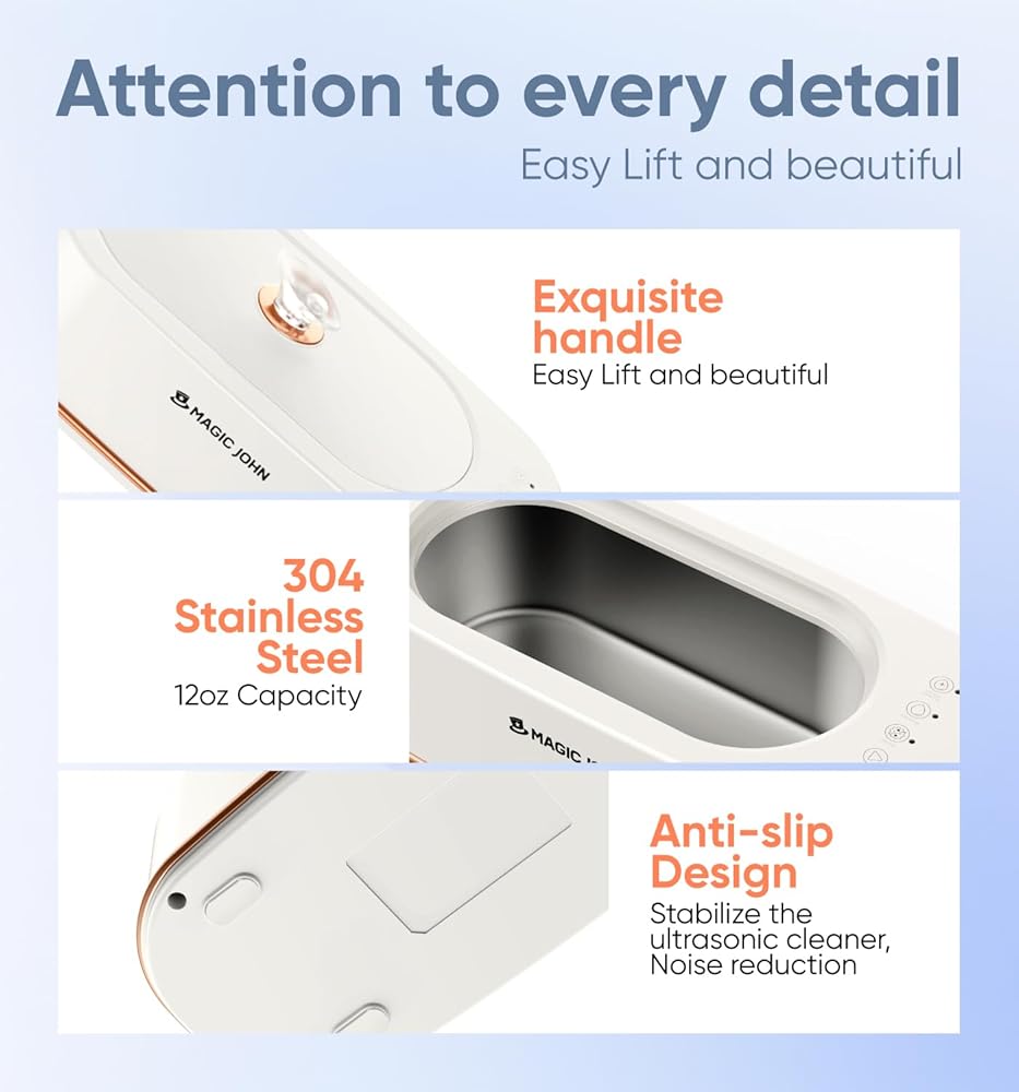 【تنظيف متعدد الاستخدامات】 تم تصميم منظفات الموجات فوق الصوتية MAGIC JOHN لتنظيف مجموعة متنوعة من العناصر. يتمتع منظف المجوهرات سونيك بقدرة 350 مل على تنظيف العناصر ذات الأحجام المختلفة ويمكن غمرها بالكامل لتنظيف شامل وهو مثالي للنظارات وفرشاة الأسنان والمصففات والمثباتات وواقيات الفم وأطقم الأسنان. بالإضافة إلى ذلك، يمكنه تطهير حتى الأشياء الثمينة الحساسة مثل المجوهرات والخواتم. تنظيف طبيعي وخالي من المواد الكيميائية مما يجعله حل تنظيف متعدد الوظائف.