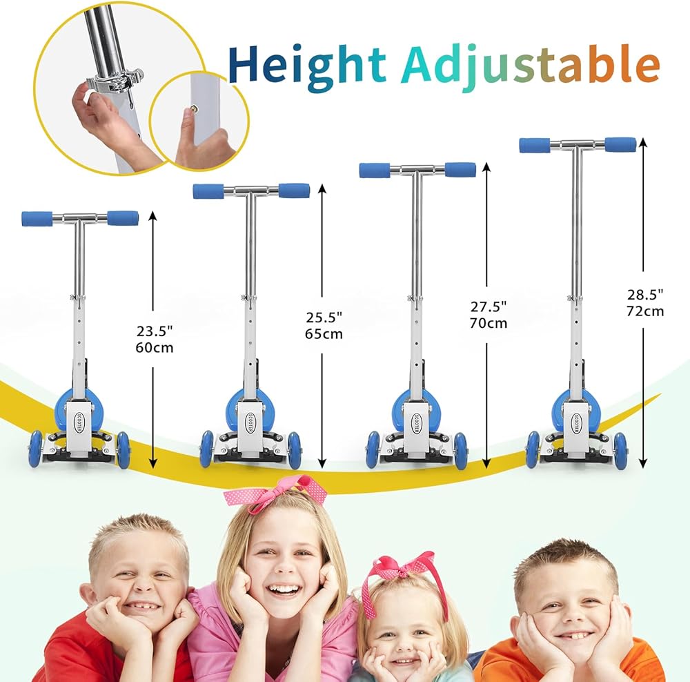 ارتفاع المقود قابل للتعديل: يحتوي سكوتر الأطفال على 4 تعديلات للارتفاع من 23.5 إلى 28.5 بوصة، ويمكن أن ينمو مع الطفل، مما يطيل عمر المنتج وقيمته. مثالية للعائلة التي لديها أطفال في مختلف الأعمار