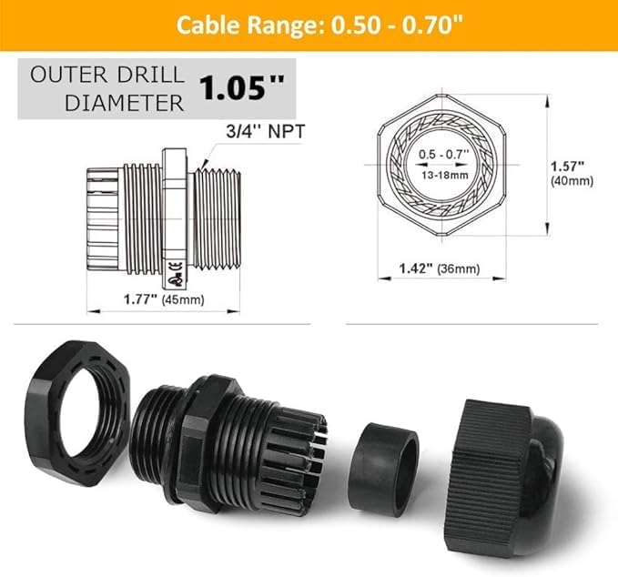 EASY INSTALLATION — Simply pass your cable through the gland and tighten the cap. Fits 0.5" to 0.7" (13 - 18mm).