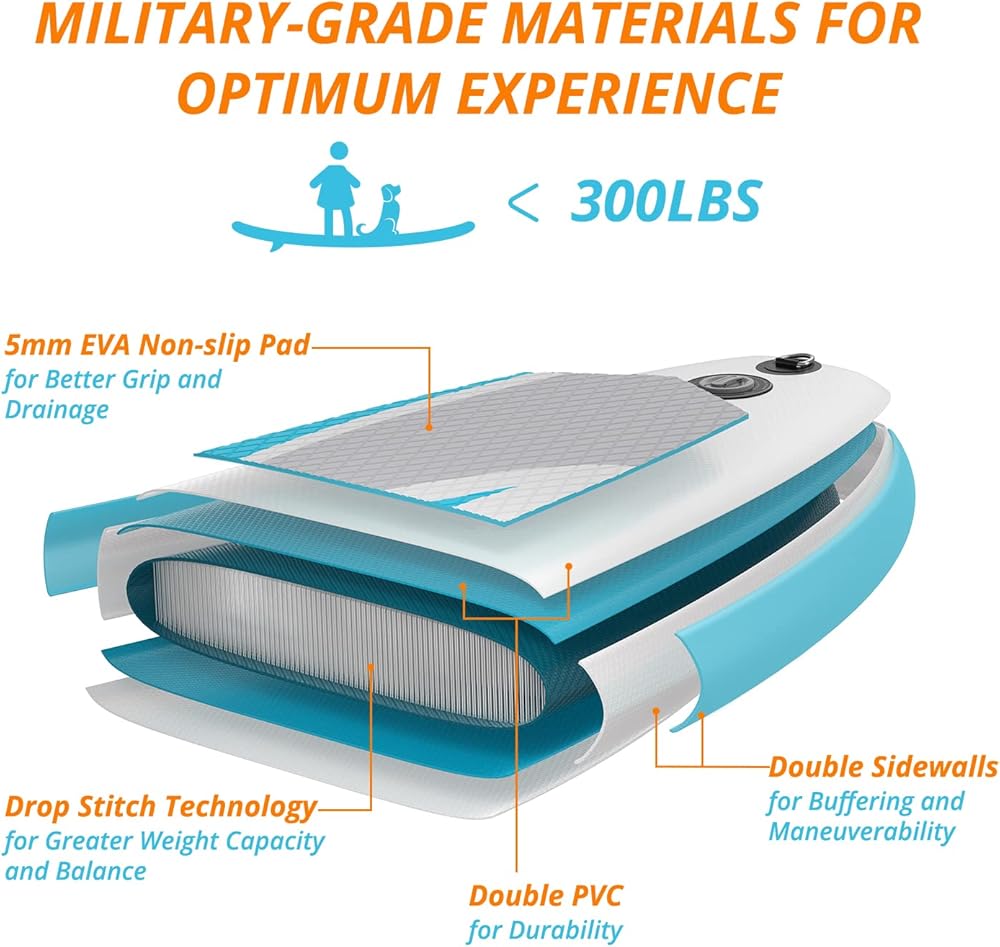 • Ultra Light & Portable: The iSUP is made of military-grade double PVC with a drop-stitch core, gives board enough cushioning. Weight limit up to 300lbs but 15.7lbs (30% lighter than others) weight allows people who are not strong to lift it easily.