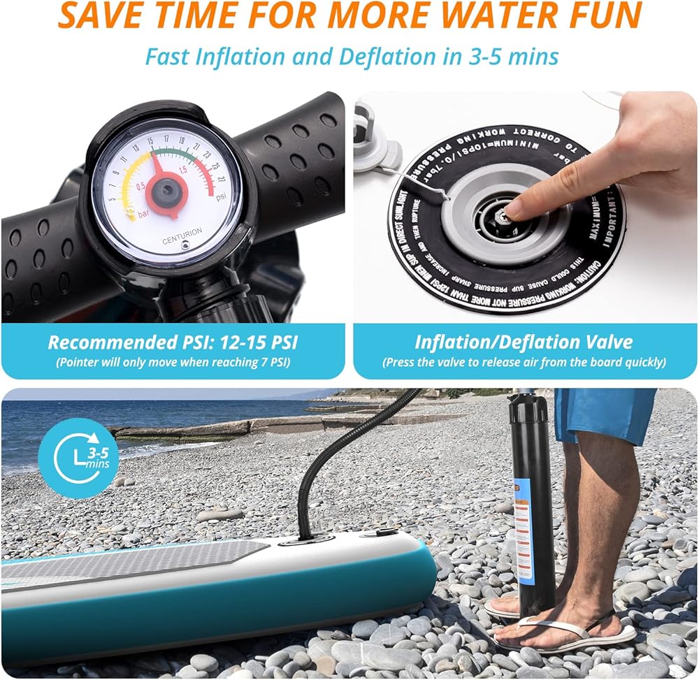 • Fast Inflation & Deflation: Equipped with a double-action hand pump with gauge, helping you to inflate paddleboard within 5 minutes! (30% faster than others) After 5-8 minute deflation, the blow up board can be folded into a portable size.